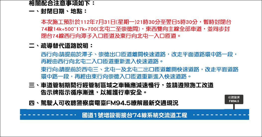 交通部高速公路局第二新建工程處為辦理國道1號增設銜接臺74線系統交流道工程,預計於今(31)日晚間21:30至翌日05:30,暫時封閉臺74線14K+500~17K+700(北屯二至崇德交流道)東西雙向全車道,進行臺74線橋面二次銜接、鋼箱梁吊裝臨時支撐架基座模板組立及混凝土澆置作業。