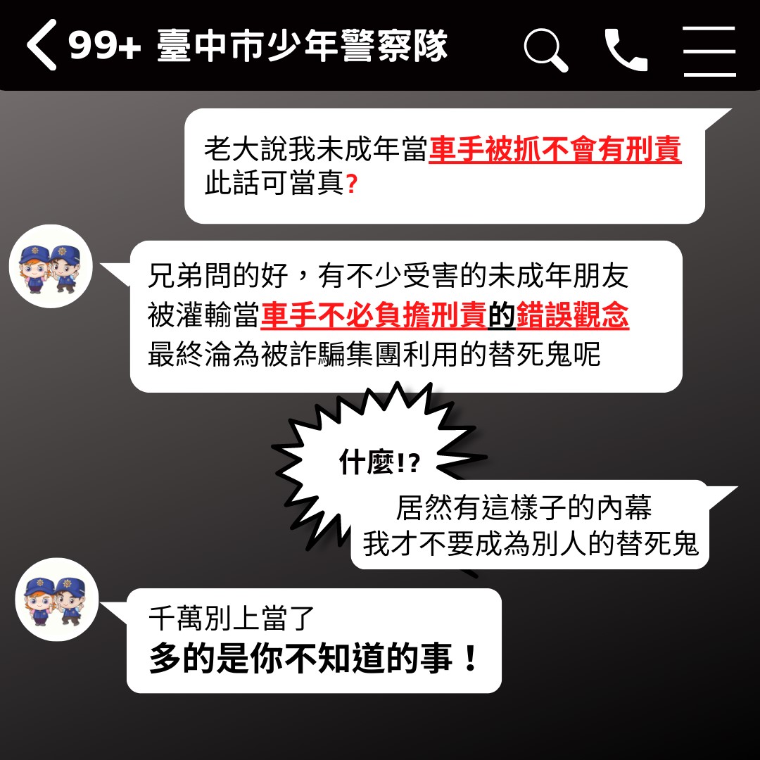 現在正值青春專案期間,臺中市政府警察局少年隊長高嘉陽特別呼籲,未成年擔任詐欺車手,被害人可依據民法第187條提起民事訴訟向詐欺車手的父母請求負連帶損害賠償責任。另少年事件處理法第84條也有相關處罰,法官可能會裁定少年的法定代理人或監護人必須接受8~50小時的親職教育輔導,如果沒有完成相關課程,還會有6,000~30,000元的罰鍰。之前有案例係未成年詐騙車手僅分得1萬元,卻遭法院判決父母須連帶賠償被害人230萬元。所以千萬注意不要落入詐騙集團的陷阱,成為詐騙集團的幫兇,找工作不成反而因此吃上官司,得不償失。另外父母及家長也應多注意孩子在外行為及交友狀況,避免淪為犯罪工具,警方將持續針對詐騙集團幕後成員加強查緝。若發現可疑請撥打165反詐騙專線、110電話查證或洽詢「勞動部勞動力發展署」專線電話:0800777888。