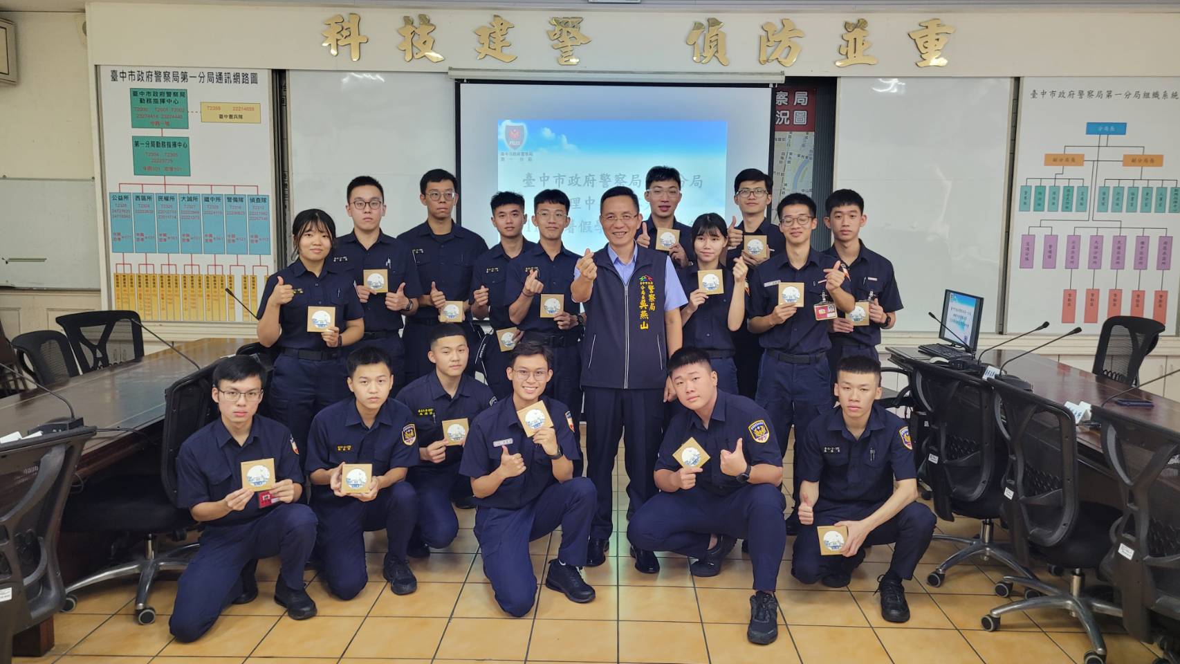 中市警一分局長吳燕山表示,非常重視實習生的實習狀況,除了要求實習指導員展現自身專業能力,平時也會到各單位關心實習生的生生活起居。會中,吳分局長致贈實習生們印有第一分局圖案的杯墊,期許各位實習生持續精進專業技能,未來畢業分發至各機關服務,能發揮所學,為警界注入新的活力。