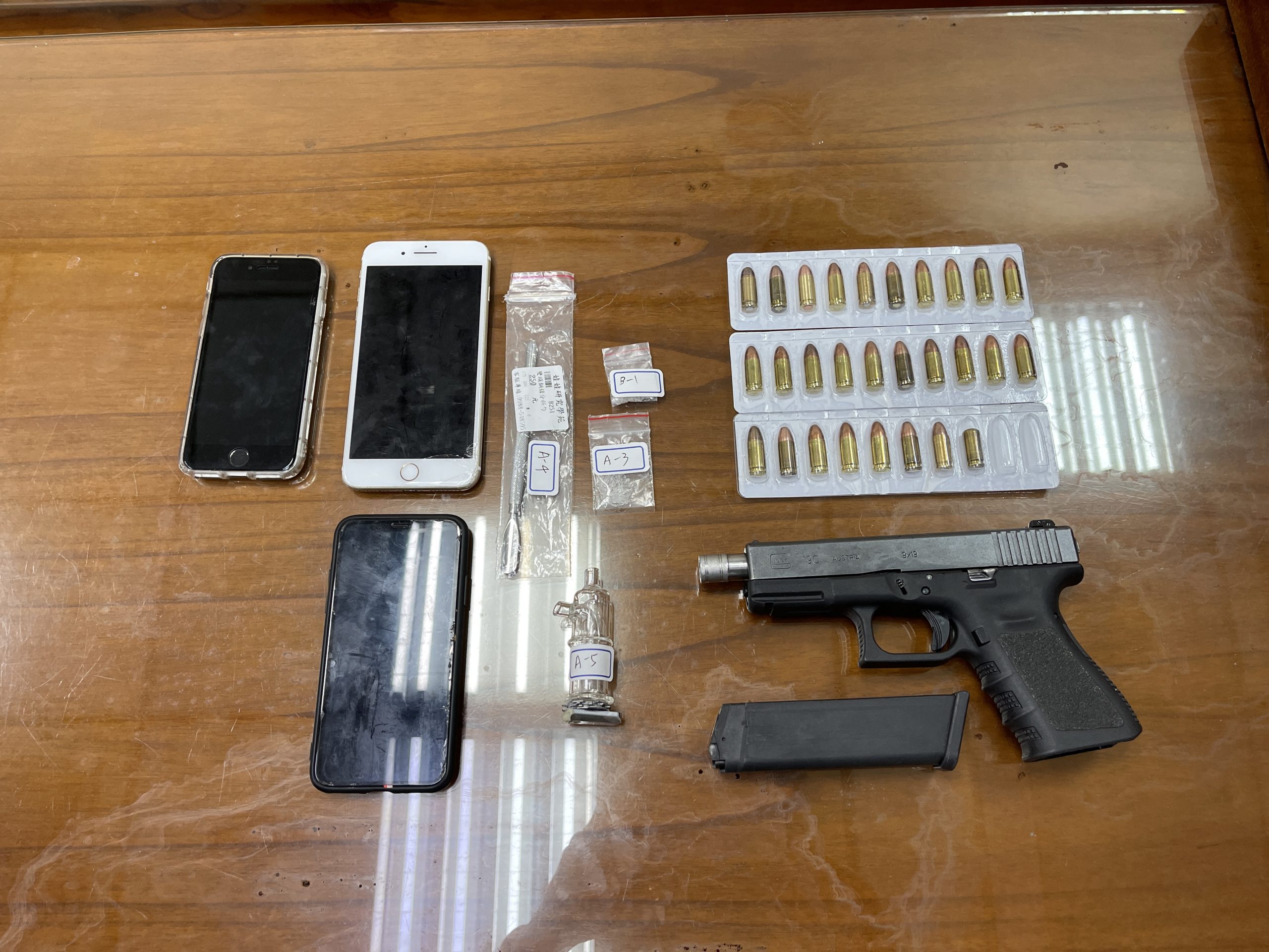 臺中市政府警察局刑事警察大隊偵七隊今年4月偵辦槍砲案件,發現40餘歲張嫌經常進出一無尾巷透天厝,沿途亦會刻意躲避監視器,情狀令專案小組懷疑該處疑似為毒品、槍械交易處所。俟時機成熟,持臺灣雲林地方法院核發之搜票執行搜索,張嫌等人一見警方攻堅破門,情急之下,突發奇想將制式GLOCK_19C手槍及20餘顆子彈裝進塑膠夾鏈袋後浸入馬桶水箱底層,未料警方搜索之詳細,連天花板、隔間夾板都不疏漏,見所藏匿之槍枝、子彈遭全數撈出,張嫌只能俯首認罪。追查發現,張嫌有吸食毒品及持有槍械等習性,終日遊手好閒,無正當工作,專案小組聽聞渠辯稱擁槍係防身之用,不禁莞爾一笑,全案訊後以違反槍砲彈藥刀械管制條例及毒品案移送臺灣雲林地方檢察署偵辦。