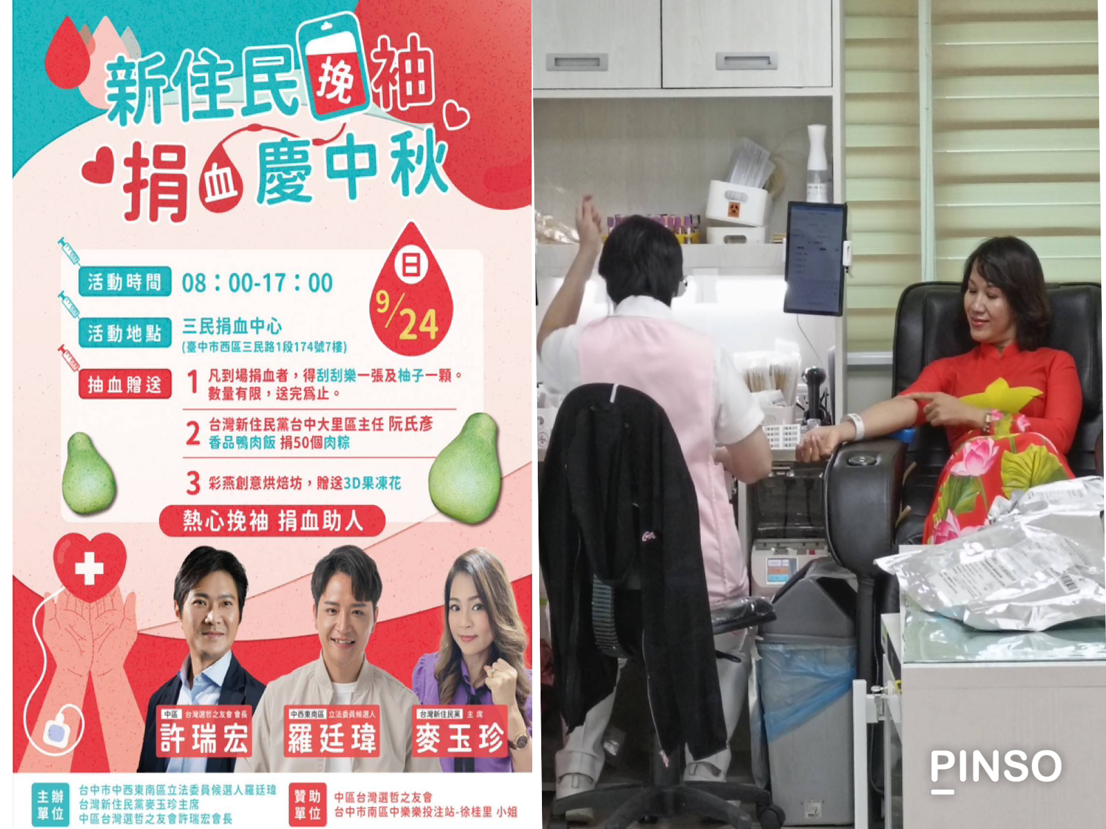 在三方通力合作下,「新住民挽袖 捐血慶中秋」活動將於本週日9月24日,在台中市三民捐血中心登場。