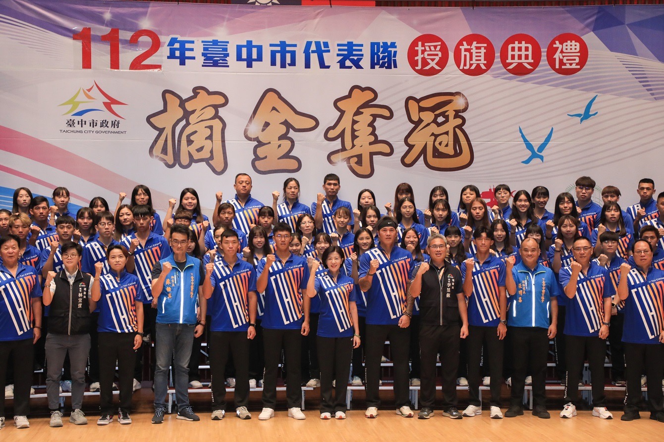 112年全國運動會將於10月21日至26日舉行,台中市副市長王育敏在運動局長李昱叡的陪同下,於今(16)日為台中市代表隊授旗,由此屆全運會划船金牌選手林子宸代表接旗,同時由亞運棒球銀牌國手陳敏賜、亞運軟網銀牌國手張祐菘、亞運女壘銅牌國家隊教練東昀錡、全運會金牌選手王致邦與帶領划船勇奪3金的許世彬主委代表接受加菜金。