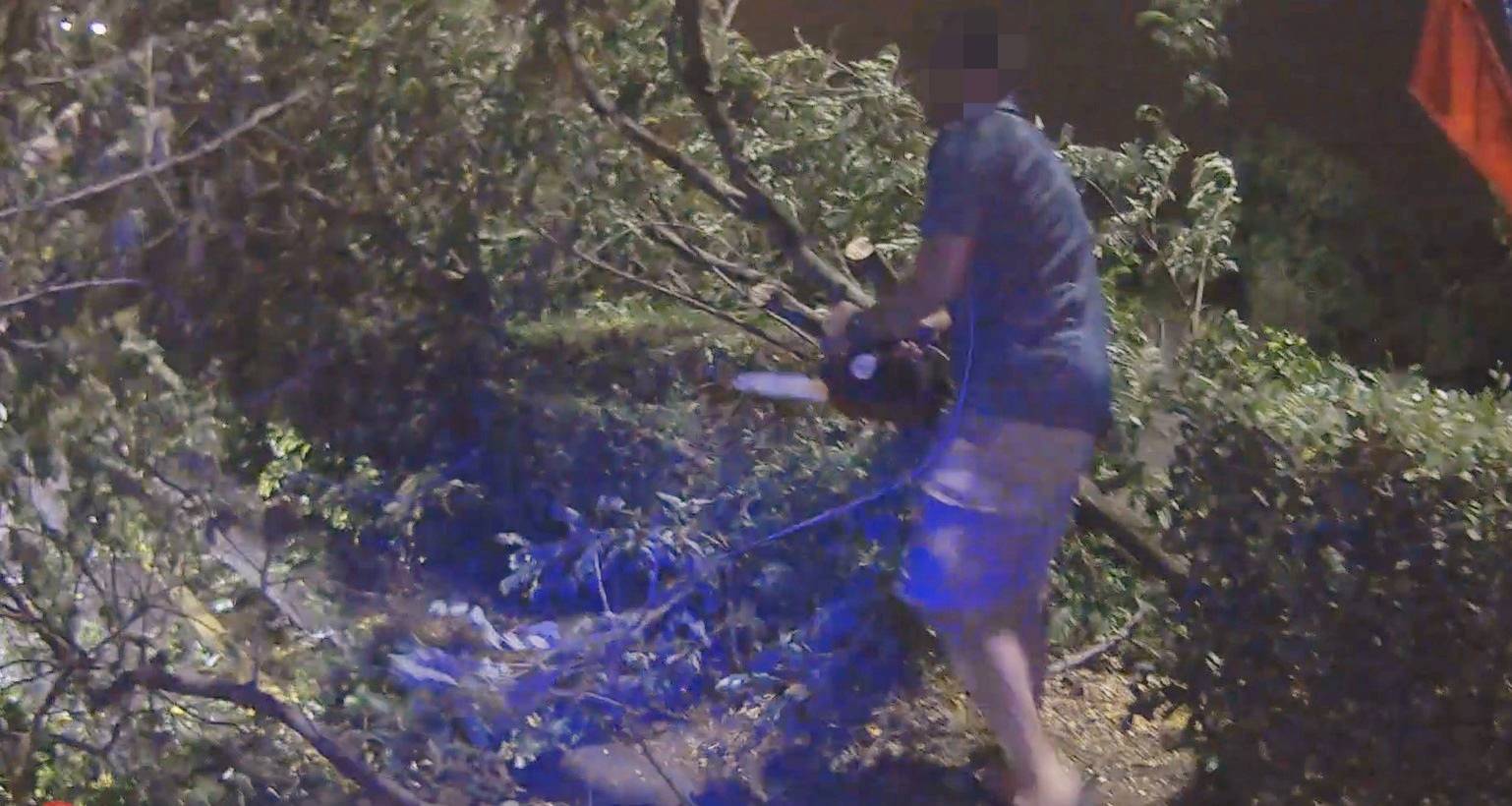 警方今日指出,當日龍井區向上路六段上路樹倒塌於路面,造成2線道受阻,員警獲報後立即趕往現場擺放交通錐實施交管,並通報相關單位處置。古道熱腸的犁份派出所警友站站長林世哲獲悉災情,隨即攜帶電鋸將路樹鋸成數段,協同員警將樹段分批移置到路旁樹叢安全地點放置。林站長在犁份派出所曾任義警分隊長7年,常大力協勤並熱心服務鄉里大小事。今年三月「轉換角色」更接下警友站站長一職,積極協助推動各項警政工作頗受好評。犁份派出所所長廖鴻隆表示感謝林站長無私的付出,對派出所各項事務的參與,不遺餘力,讓同仁無後顧之憂,在任期間為警察同仁最大後盾。