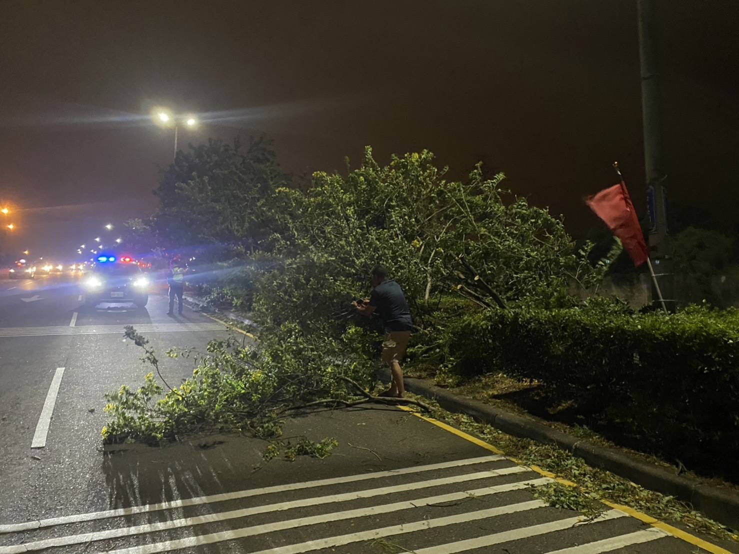 日前小犬颱風襲台,陣雨挾帶狂風大作,晚間20時許造成向上路六段上路樹倒塌影響交通。犁份派出所警友站站長林世哲知悉災情後,立即主動冒著風雨攜帶電鋸等工具前來鼎力相助,並偕同員警合力搬運清理路面上的樹幹、樹枝及清掃散落土石,恢復道路通行。