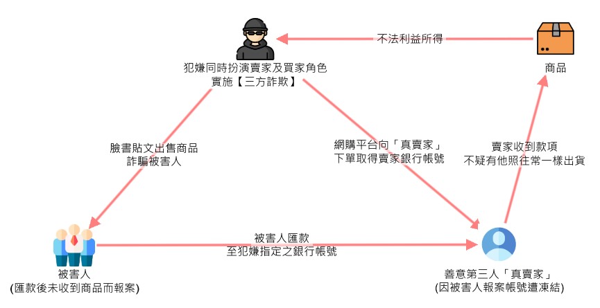 臺中市政府警察局刑事警察大隊於近期偵破三方詐騙案件,犯嫌於112年7月間於社群、網購平台上,以多個假帳號一人分飾二角實施詐騙,分別散布便宜出售機車零件、遊戲點數訊息,先扮演「假賣家」,來誘騙「真買家」上鉤,再以該等假帳號另扮演「假買家」,向網路其他「真賣家」購買遊戲商品,或代匯、代交易等方式,取得其銀行匯款帳號後,提供給遭詐騙之「真買家」匯款交易,而提供匯款帳戶之「真賣家」於帳戶收到款項後,依約定提供商品給犯嫌,葉嫌從中獲利,等到被害的「真買家」久未收到商品又連繫不上犯嫌而報警遭詐騙,也導致被害的「真賣家」帳號遭警示,遭受損失,這就是「三方詐騙」手法。