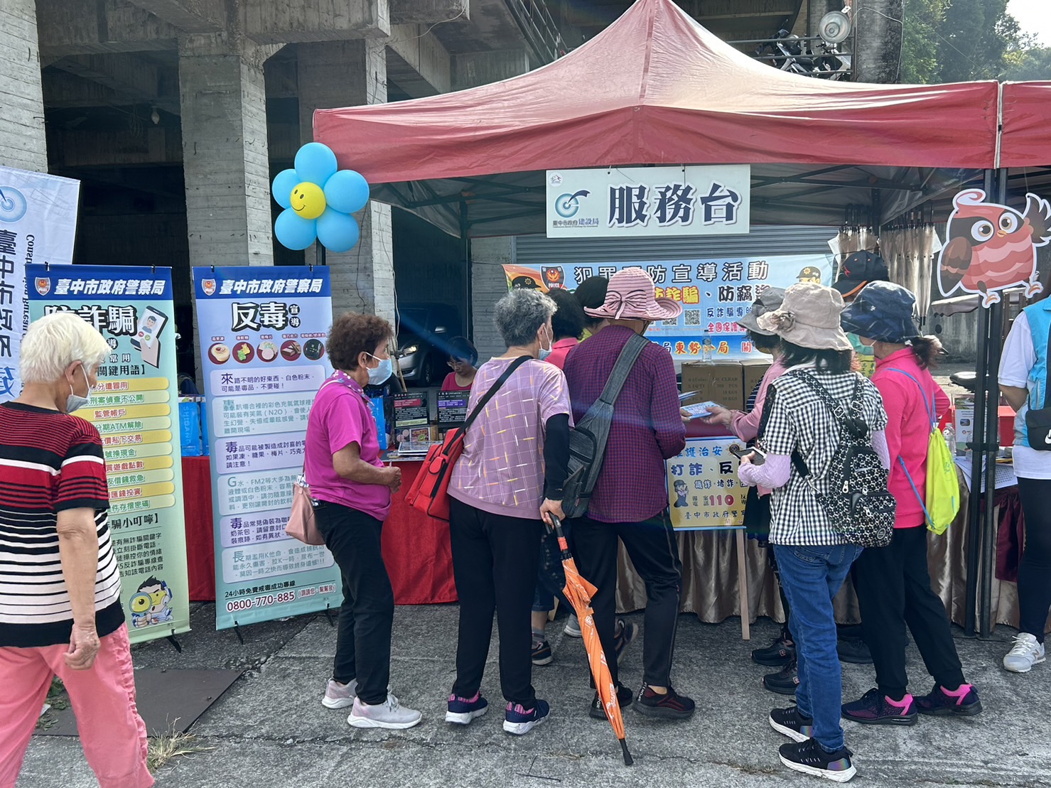臺中市政府警察局結合經濟部水利署中區水資源分署及台中市石岡區公所於日前辦理「文化產業暨珍惜水資源健行活動」現場設攤,向早起參與健行活動的台中市民朋友傳授犯罪預防知識,盧市長亦至石岡區石忠宮參與活動,並與中市警局一同向現場民眾進行防詐騙宣導,提醒市民朋友,網路上的投資廣告不可盡信,做各項財務規劃務必提高警覺,謹慎查證投資管道。