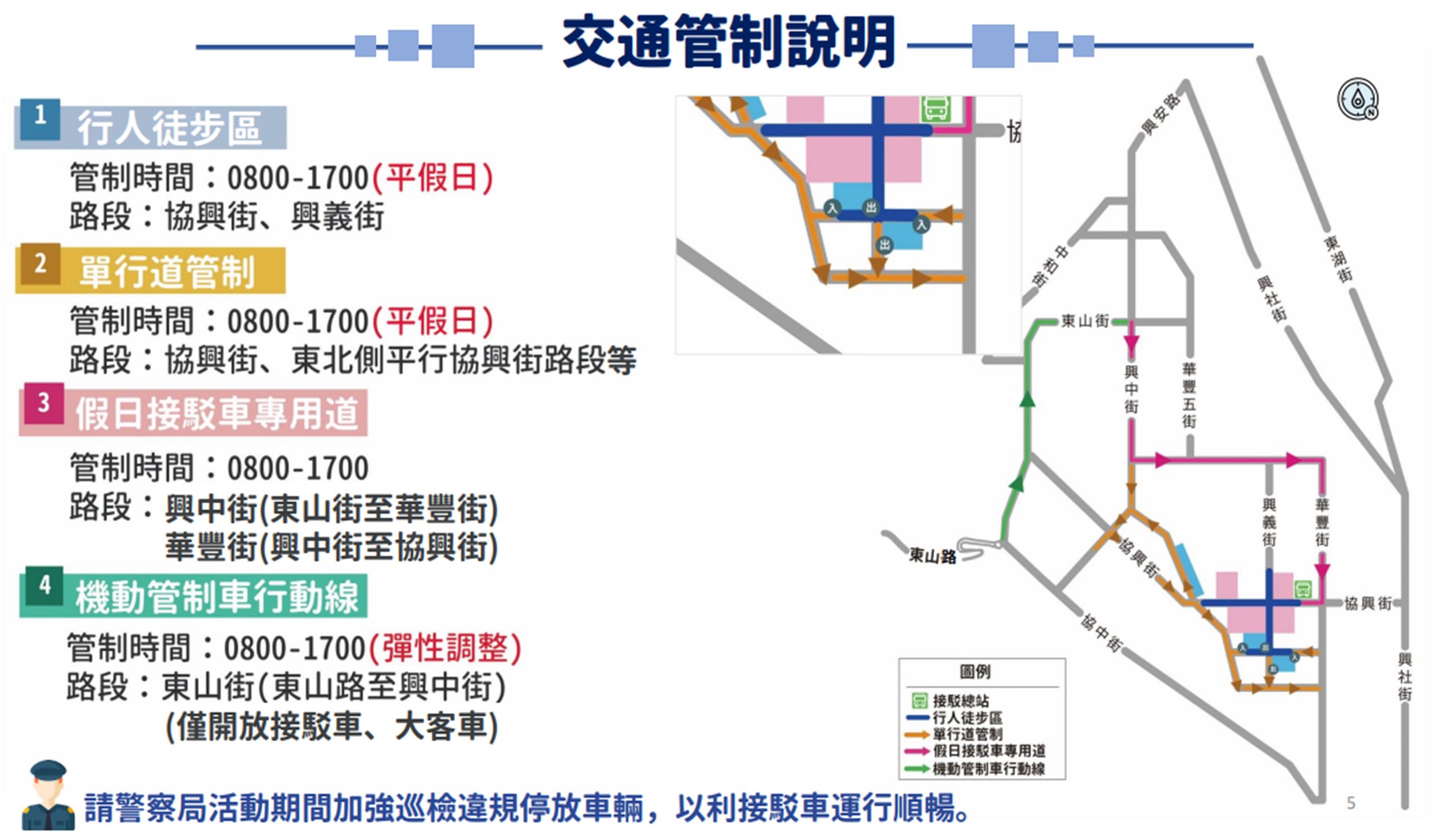 二、單行管制:從東山街與興中街起,向南至興中街與協中街口,都是單向管制。以及協興街與興中街起,至協興街與苗圃橋(花海徒步區入口)止,都是單向管制。