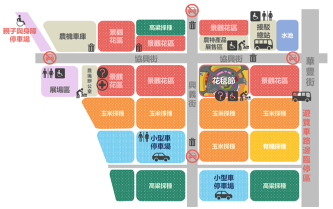 因新社區道路條件限制,既有停車空間難以因應短期間大量遊客湧入需求,勢必易造成交通壅塞,東勢分局協同支援警力於新社區協興街與華豐街口、協中街與興中街口(水塔)、中興嶺圓環、興社街一段與國校巷口、興社街一段225巷口等37處,視車流多寡彈性部署1-2名警力及1-2名義交執勤交通崗,維持交通順暢。另外,主辦單位也規劃了花海展區的管制措施: