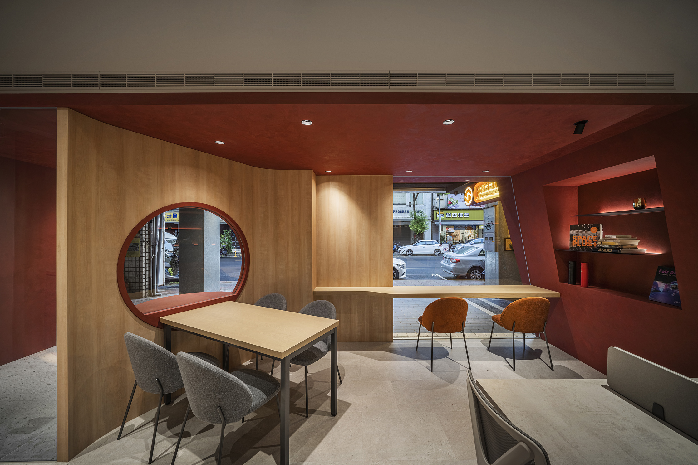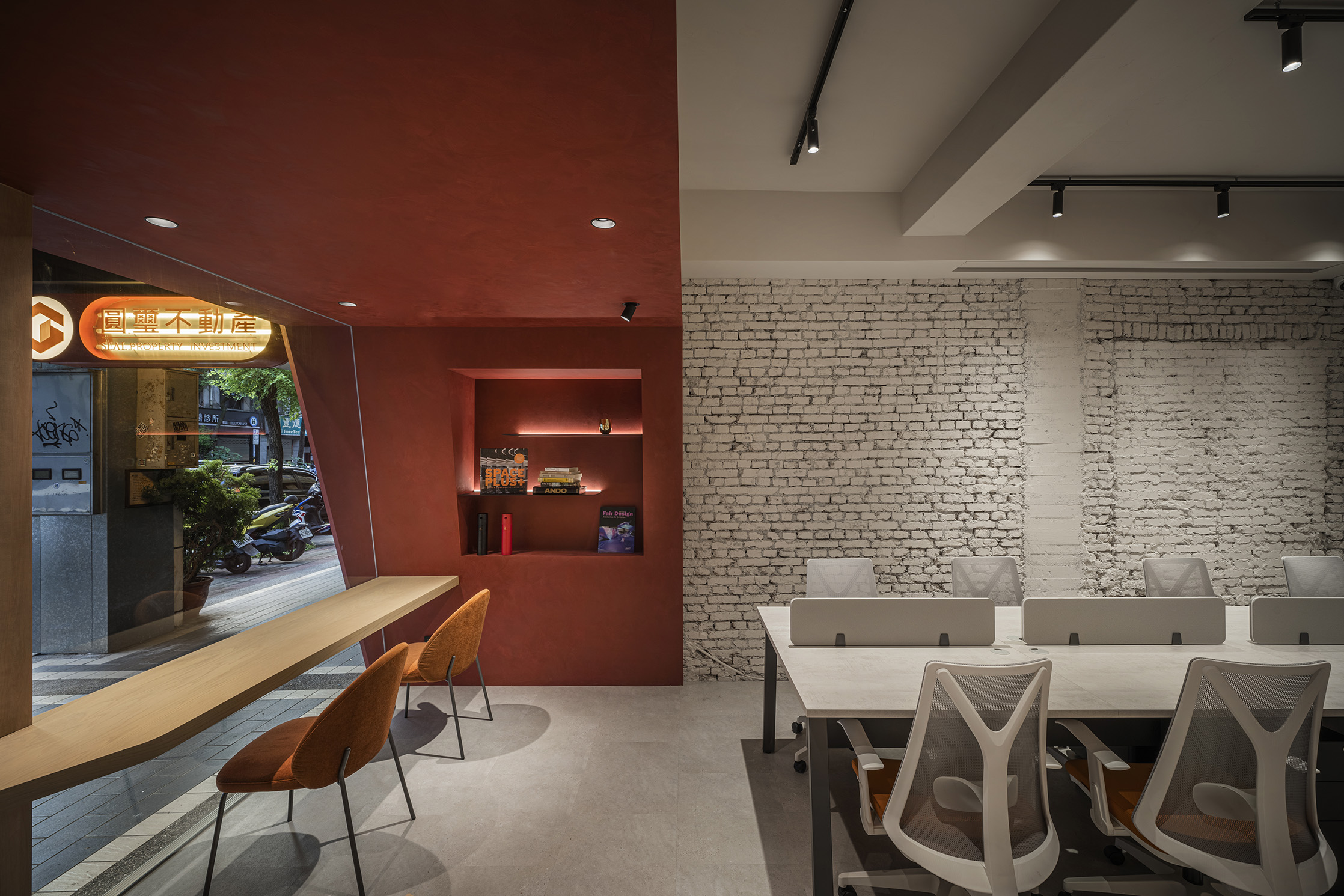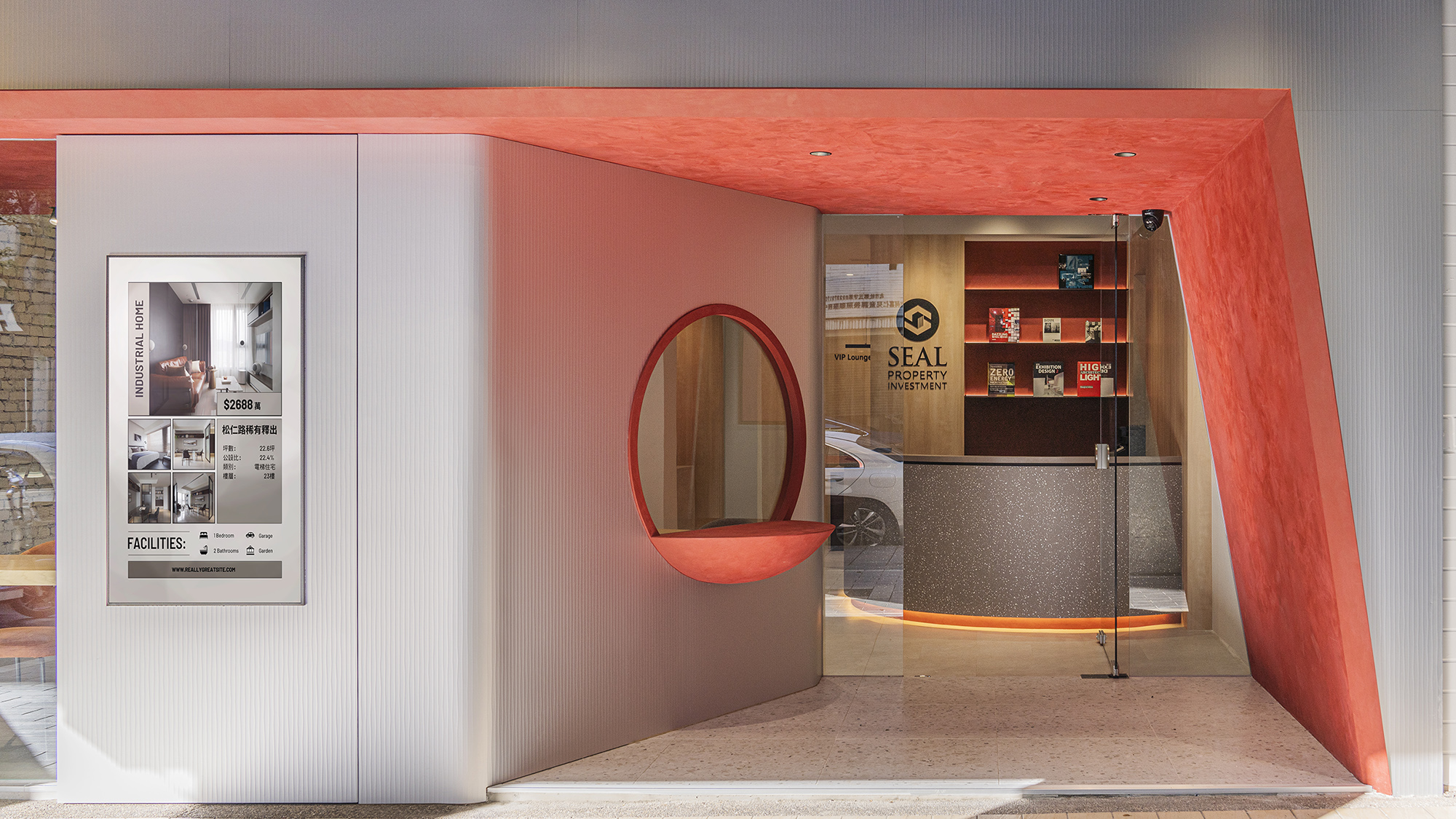 來,在摩天大樓矗立的金融商業信義區,有一個新成立的空間,吸引很多路人駐足旁觀,從外觀可見傳統眷村感的紅色大門、裸露白色文化石牆與一面面書牆,加上梯形的流暢線條,引起許多人好奇究竟這一家什麼樣的店?走進去才發現是一間房屋仲介公司。由中信房屋圓璽團隊攜手泛設計,顛覆一般人對房仲業商業空間的想像,摒除緊密依靠、踵接肩摩的規劃,以放大的書香空間、宛如咖啡館的紓壓、放鬆氛圍,營造出信義區最新的居民交流中心。
