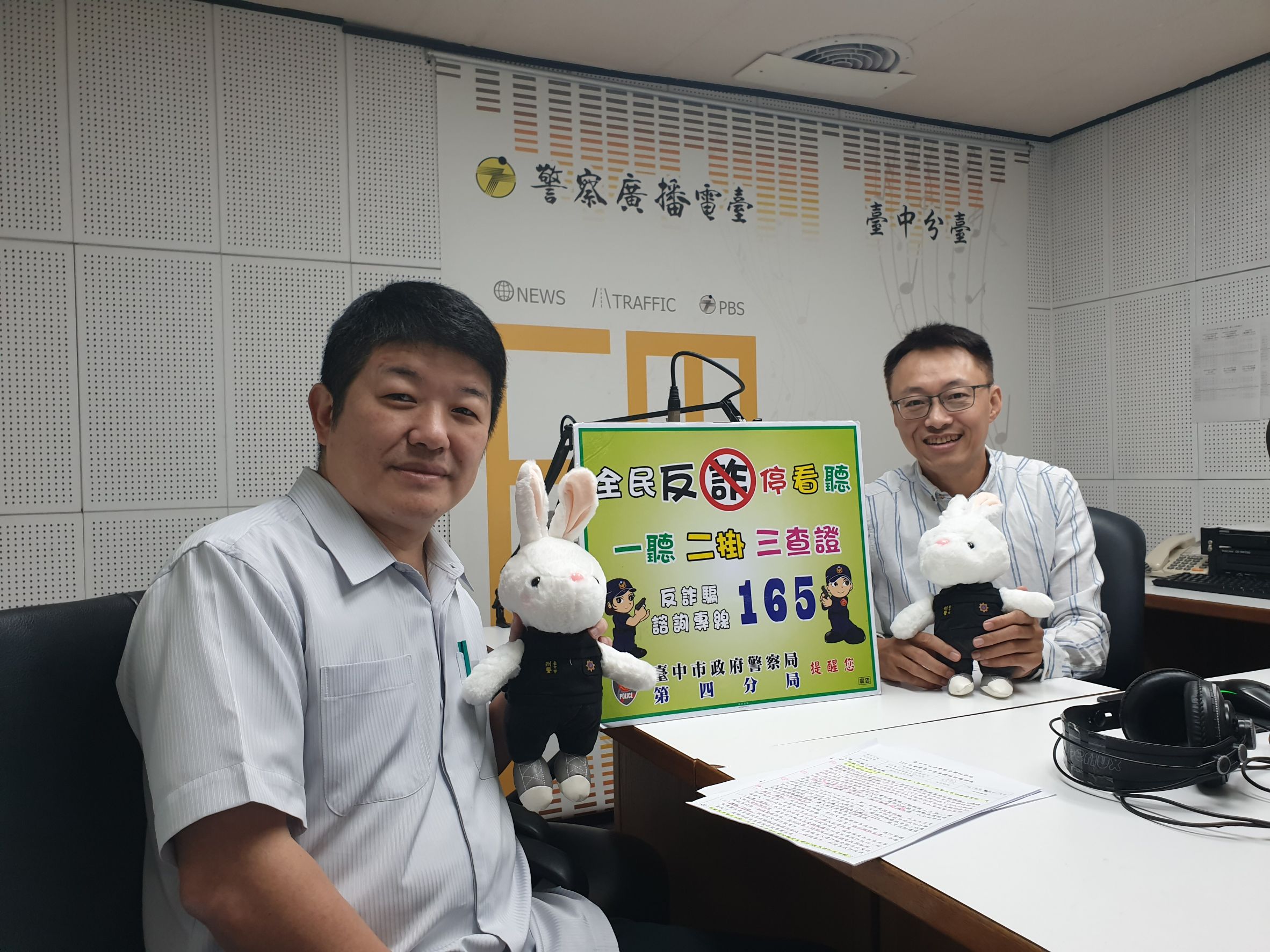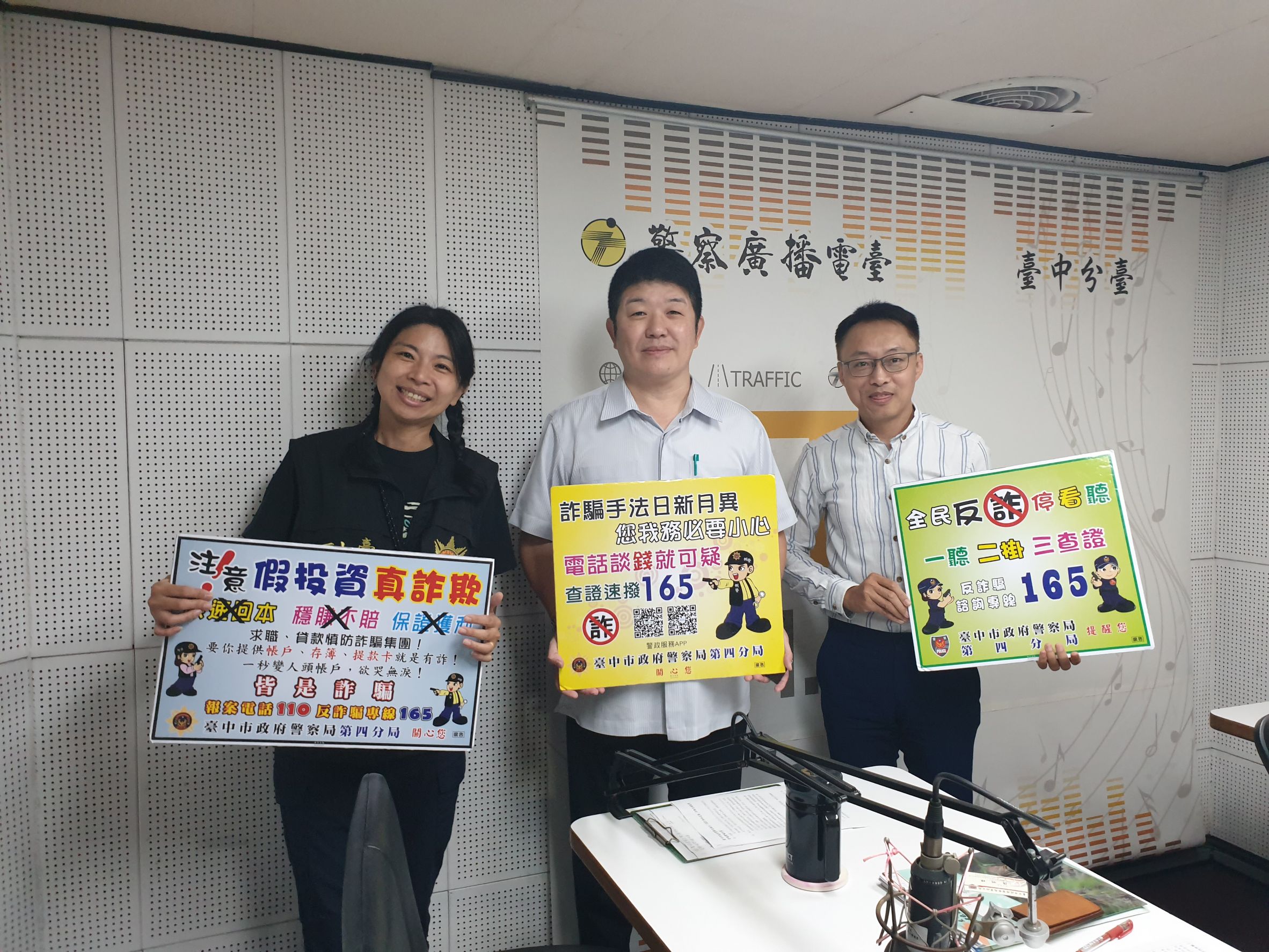 中市警四分局張明輝副分局長(中)至警廣宣導反詐騙。(圖/記者謝榮浤翻攝)