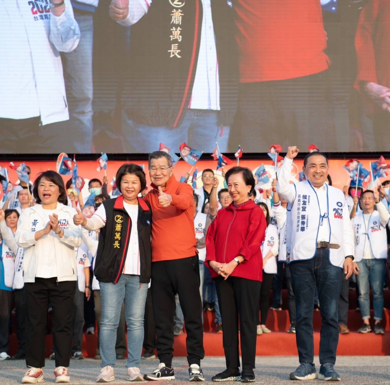 蕭萬長則是在夫人朱俶賢陪同下,登台力挺侯友宜與張秀華。蕭稱讚侯同為基層出身,努力奮發向上,也讚許張秀華扎根基層的用心,語畢,蕭萬長脫下身上的背心,在黃敏惠的協助下讓張秀華穿上,蕭表示,這件背心是民國84年返鄉參選立委的戰鬥背心,傳承給張秀華,格外有意義。
