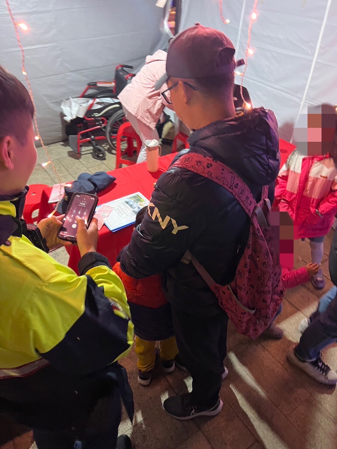 男童臉上充斥著驚慌與淚痕,顏副所長立即上前安撫男童情緒,巧妙詢問他與誰一同來的。男童支支吾吾表示跟爸爸一起來。還好男童記得爸爸的手機號碼,警員葉建平迅速撥打電話,順利聯繫上男童的爸爸,通知他至耶誕嘉年華服務站接回走失的男童。