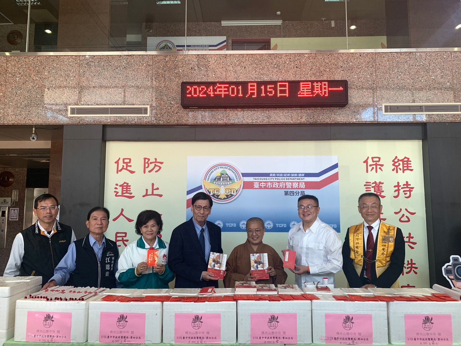 隨著總統、副總統大選平安落幕,緊接著年節期間各項工作緊鑼密鼓展開,惠中寺覺勤法師率金剛大隊長江峰平及護法幹部陳碧月、江進助為慰勞員警辛勞,前往轄內臺中市政府警察局第四分局分贈300碗象徵平安祈福的臘八粥予每一位同仁,年節期間的贈臘八粥的活動,是祝福也代表傳承,八種食材融合其中熬製成的粥,在佛陀的加持下分享給大家,讓寒天執勤的同仁吃上一口暖粥入胃,象徵傳遞平安喜樂;此外,由星雲法師親自揮毫的墨寶:雲水自在、祥和歡喜,勉勵眾人處處皆自在安樂,時時都歡喜吉祥,願新的一年開始就有好兆頭。