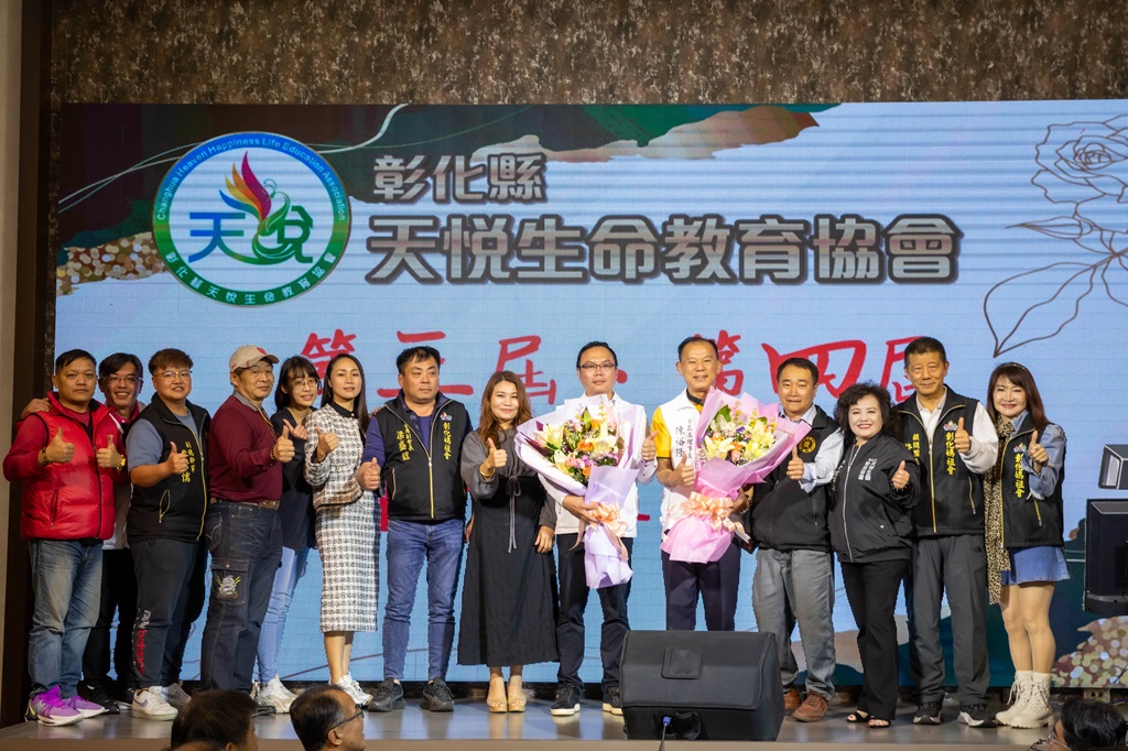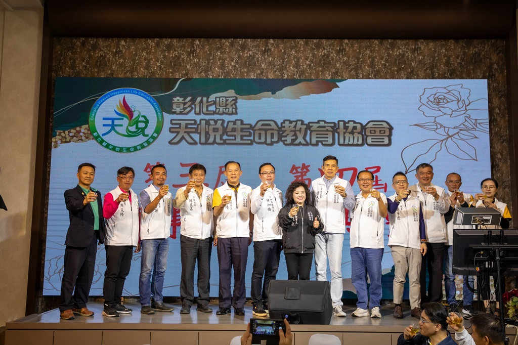 新任理事長林加倫表示,感謝創會長吳淑敏與理事長陳裕隆兩人8年來打下的基礎,接下理事長棒子誠惶誠恐,將用在社團的經驗,結合更多有志之士一起做更多好事,天悅生命教育協會是為了當領頭羊,做「義」的事,幫助他人有一個被看見被關懷被祝福的舞台機會,共同為美好彰化而努力。