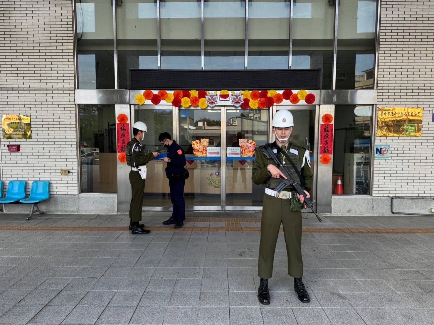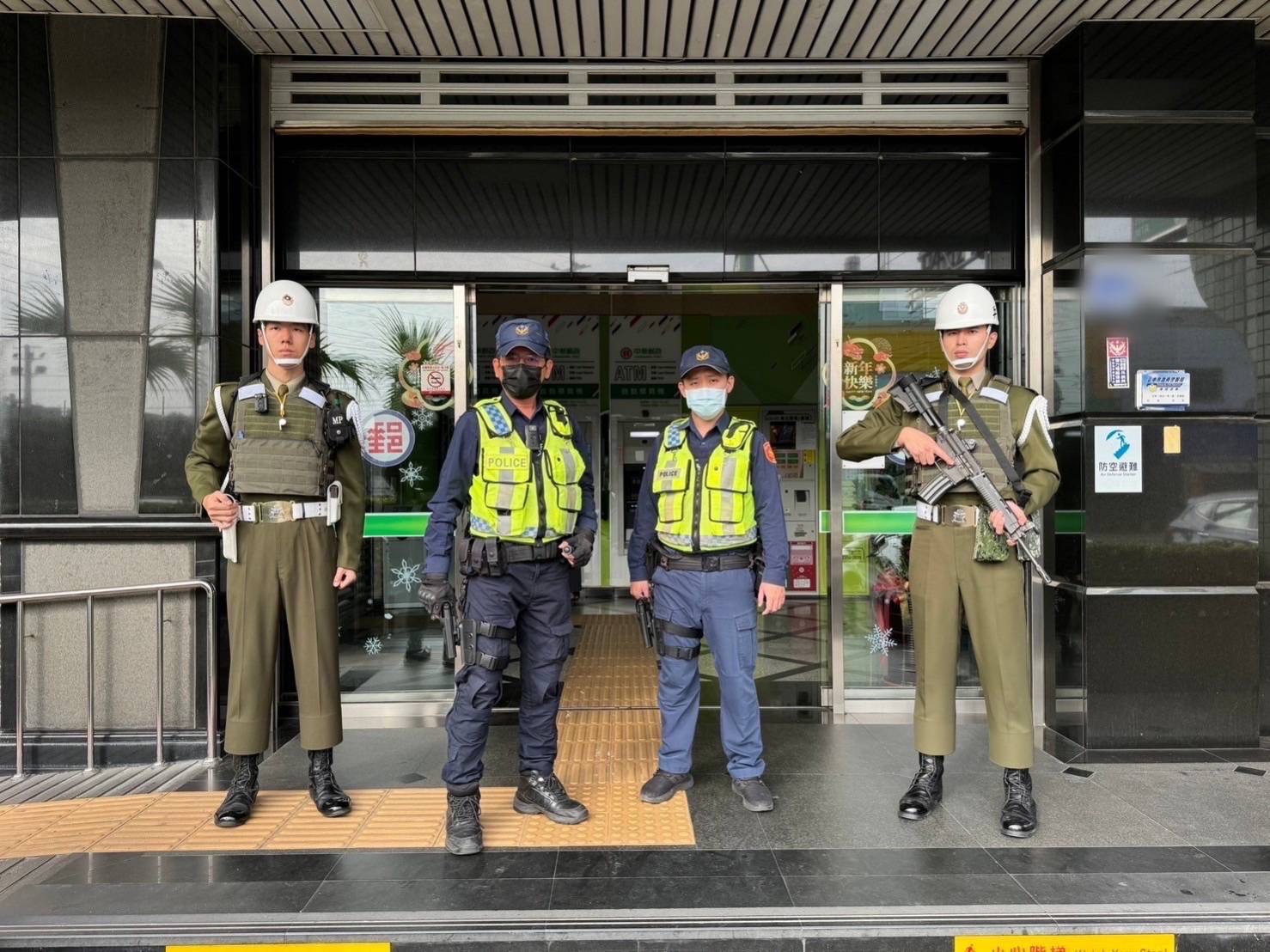 因應春節,民眾領款頻繁,為維護民眾存、提款的安全,臺中市政府警察局烏日分局烏日派出所日前特地邀請臺中憲兵隊共同出勤,針對轄區金融機構等財物易匯集處所加強安全維護。難得一見的憲警同框畫面,使路過民眾紛紛投以好奇目光。