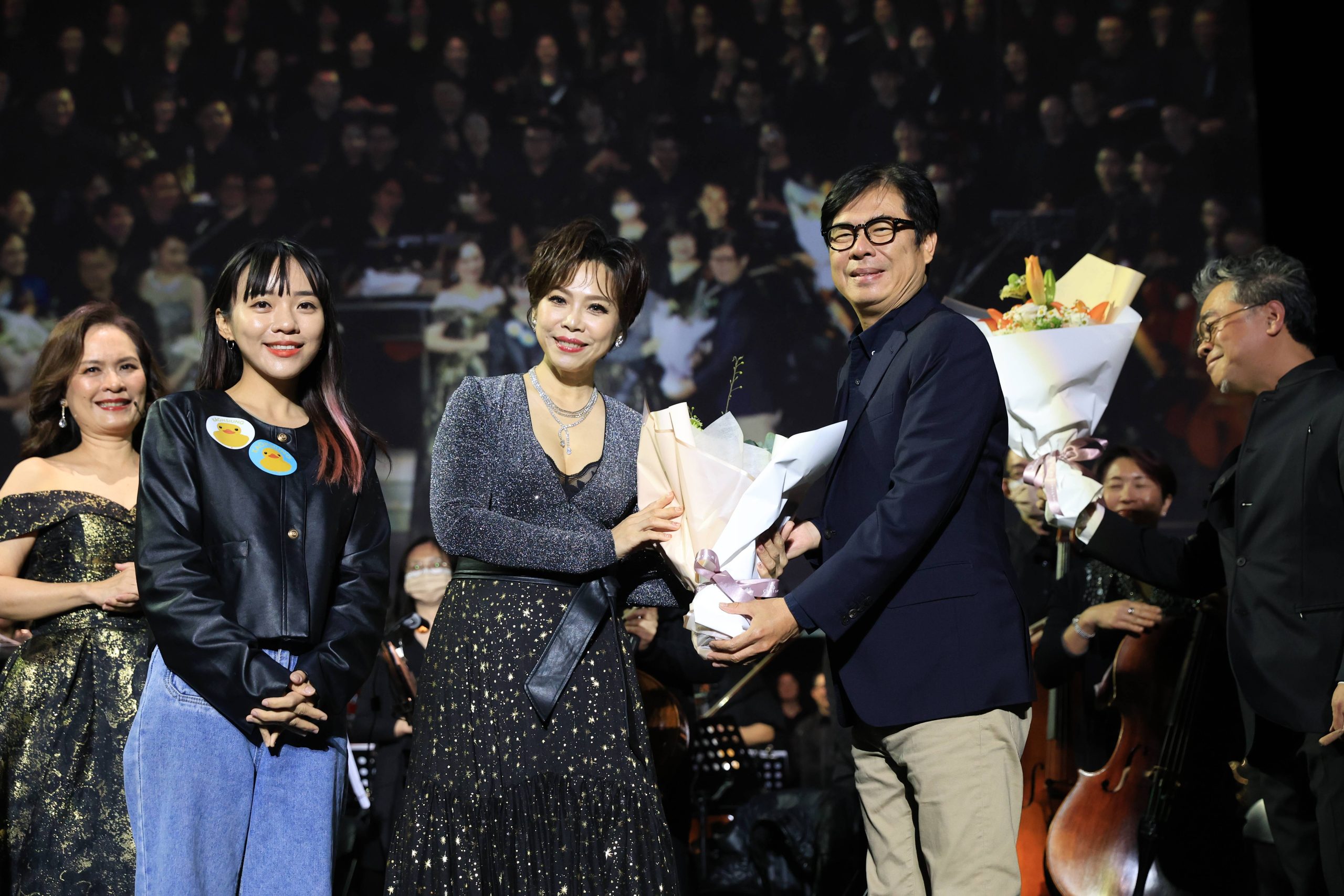 出席「出日頭」228草地音樂會 陳其邁獻花予演出人員表達感謝。〈圖/記者蔡宗武翻攝〉