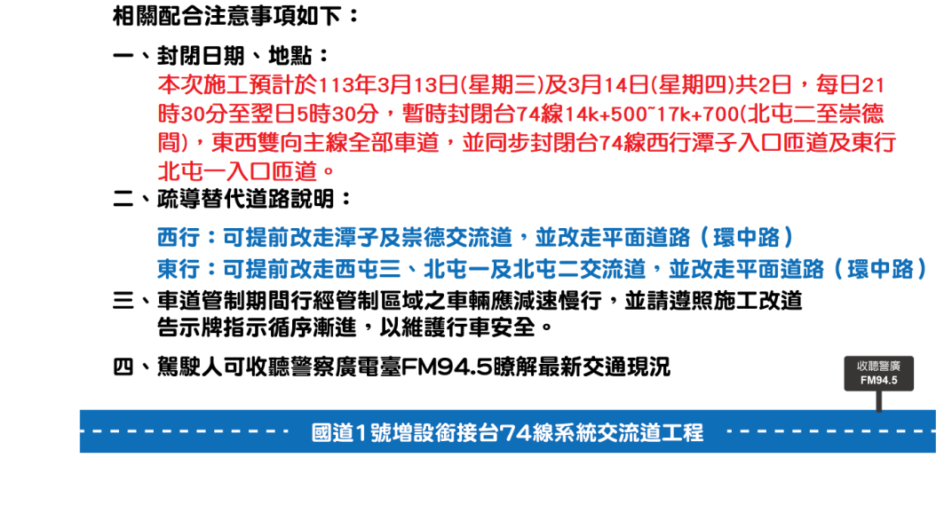 交通部高速公路局第二新建工程分局為辦理國道1號增設銜接臺臺74線系統交流道工程,預計於113年3月13日(星期三)及3月14日(星期四)共2日,每日21時30分至翌日5時30分,暫時封閉臺74線14k+500~17k+700(北屯二至崇德間)東西雙向主線全部車道,並同步封閉臺74線西行向潭子入口匝道及東行向北屯一入口匝道。