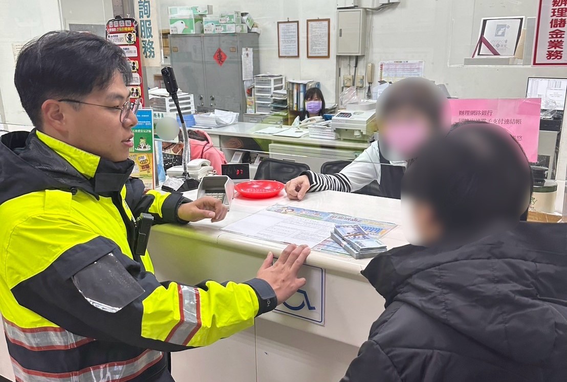 豐原警分局翁子派出所警員詹智皓、黃俊銘於日前下午2時接獲郵局行員通報,有民眾疑似遭到詐騙,需要警方到場協助。經了解,該名64歲郭姓男子以務農為生,近期天候不佳未耕作,閒來無事的他才會靠滑手機上網打發時間,幾日前郭男無意中看到Facebook社團介紹海外投資的資訊,並聲稱投資海外股票「穩賺不賠」,看得郭男心動不已,立即依內文聯絡資訊主動聯繫。當日陰雨綿綿,郭男心急地與妻子一同趕赴郵局,欲提領15萬元依客服人員辦理匯款手續,幸行員機警察覺有異,通報警方到場處理。