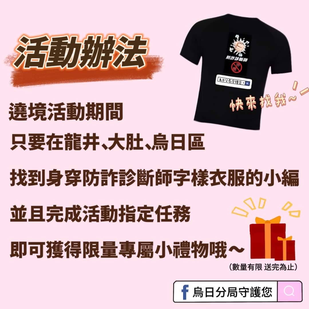 在遶境期間,只需找到身穿「防詐診斷師」服裝的工作人員,與其合影並完成指定任務,即可獲得烏日分局贈送的實用小禮物,包括按摩槌、反毒宣導扇、頭巾等多項宣導品。