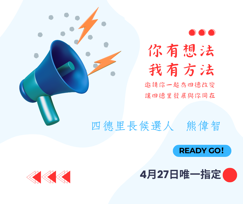 四德里長候選人熊偉智服務團隊表示,熊偉智雖然年輕,但有想法、認真改變,將全力以赴,以關懷與責任為核心,加強對勢家庭的支持,推動育兒中心的建設,改善交通動線,為四德里居民打造更美好的生活環境。期待與您攜手,共同建設一個更加溫馨、和諧年輕的「新四德里」!
