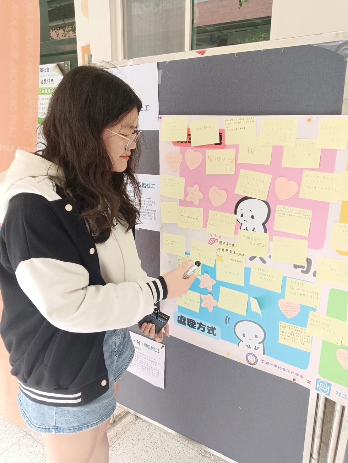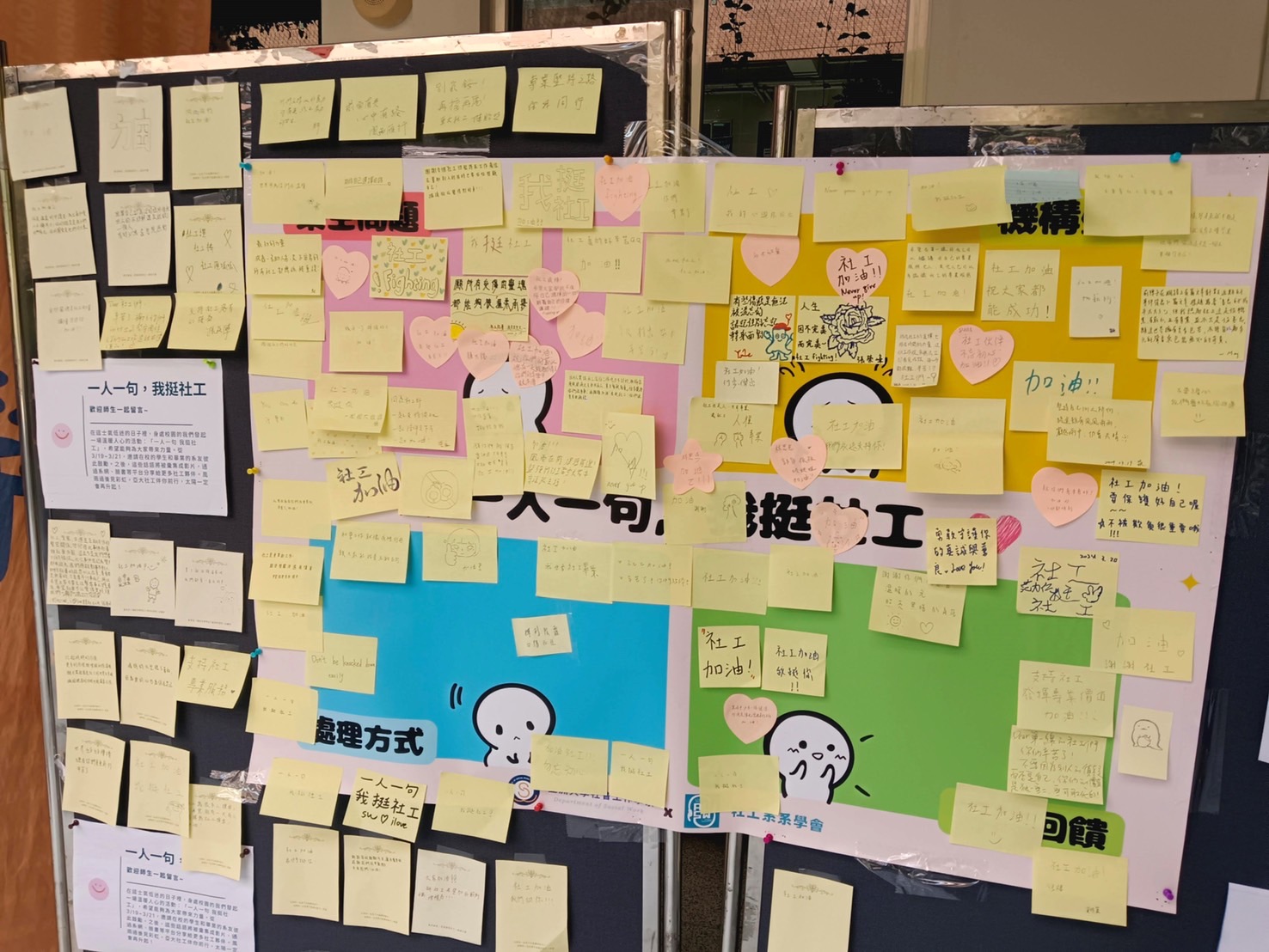 社工系也從3月19到21日,在亞大校園發起「一人一句,我挺社工」活動,全校師生響應熱烈。非社工系的同學也紛紛寫下挺社工的留言,包括:「謝謝這個擾亂的世界,還有社工堅守自己的熱情繼續努力著」、「感謝你們對台灣社會的努力付出,在社會工作上保持專業和熱忱,加油!」、「雖然我不是社工系的,不過以前有接受過社工的幫忙,社會上有很多人的生活及心理,需要你們來照顧與維護謝謝!」、「勇敢守護你的真誠與善良」、「一起支持彼此、一起走下去、一起加油!」