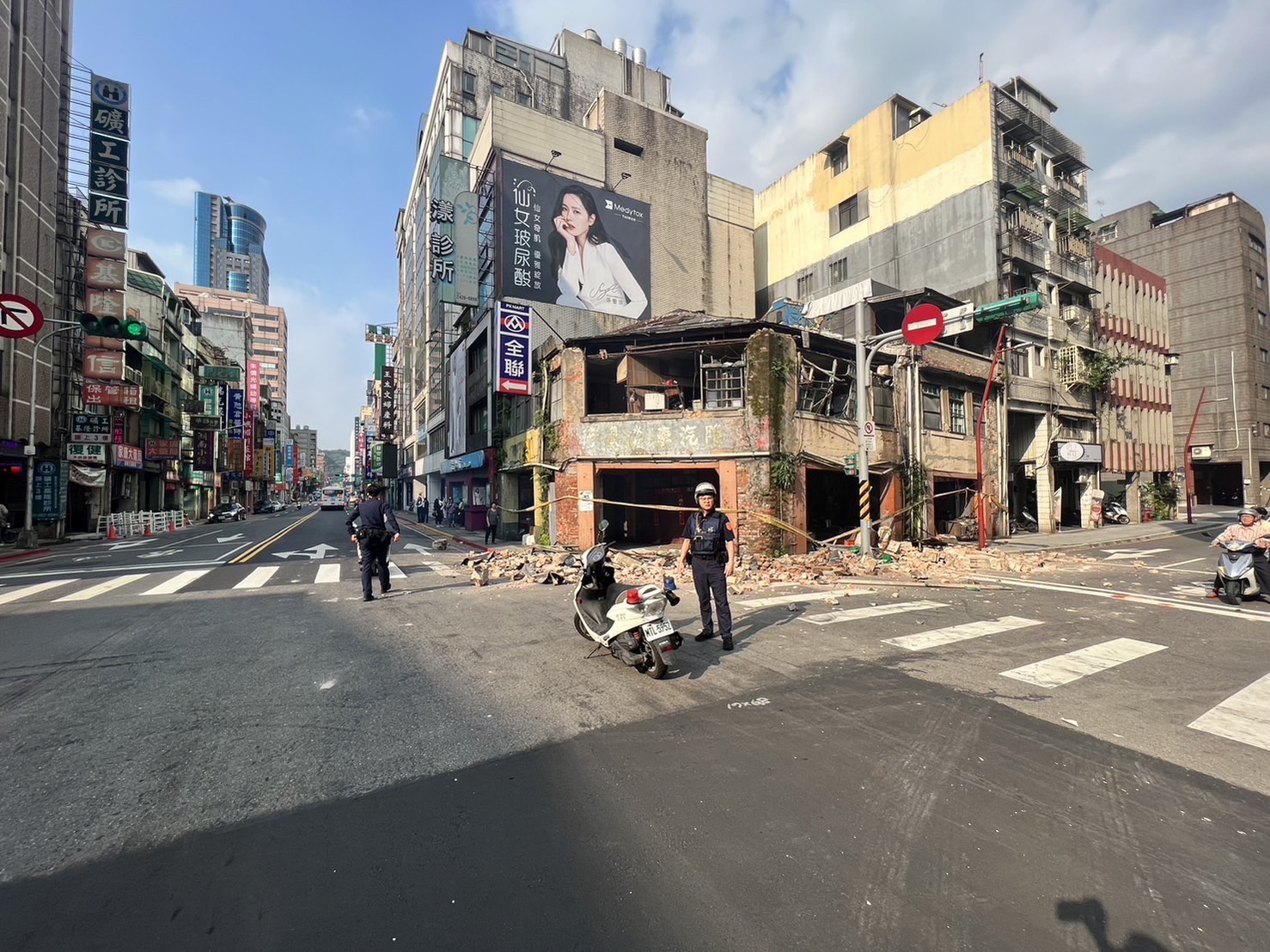 警方發現,因地震造成房屋倒塌,磁磚、石頭等物散落於道路上,影響人、車往來安全,為免發生危險,員警立即設置警示交通錐、拉起封鎖線指揮車輛改道行駛,並請用路人注意行車安全,同時通報市政府派遣作業人員及大型機具將倒塌房屋進行拆除,警方也在場持續交通疏導管制,維護用路人安全。