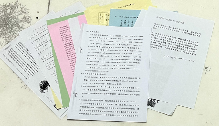 黃理事長年來也蒐取各種關於國際對於茶葉的媒體報導,其中一份根據TVBS新聞在2005年2月14日中午11:36報導的一份瑞典研究:女性朋友若是每天喝至少兩杯的紅茶或是綠茶,可以降低罹患卵巢癌機率,其記錄蒐取時間甚是清楚。