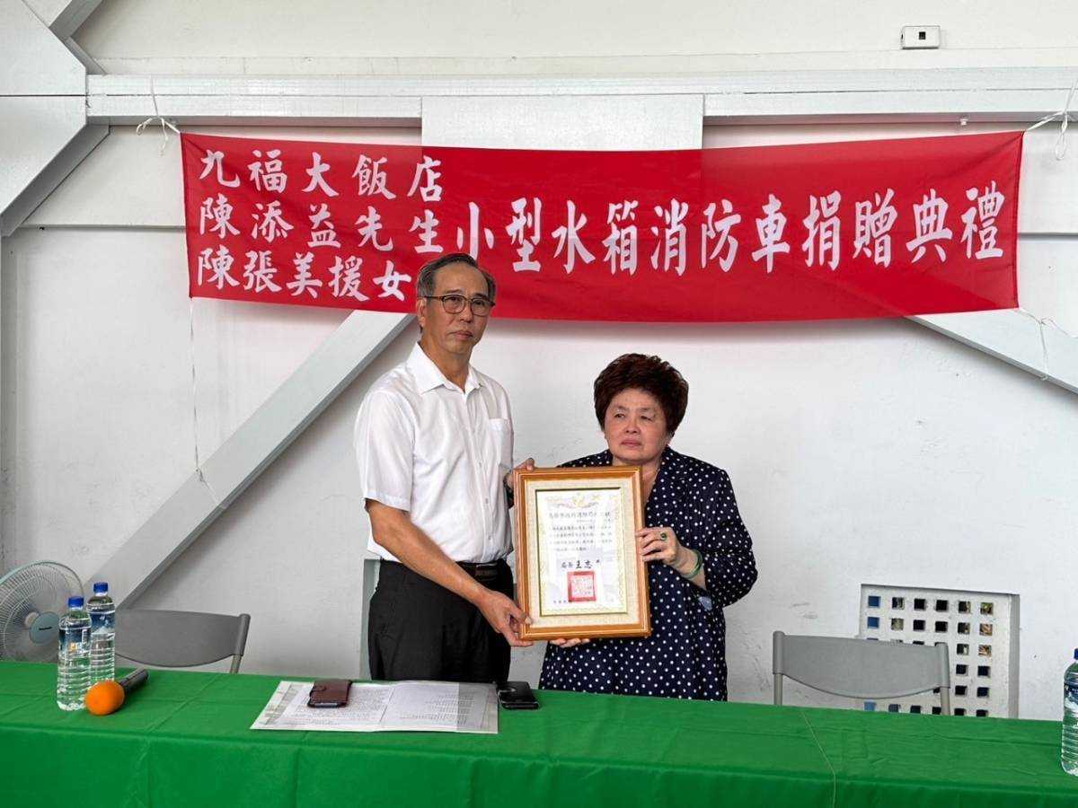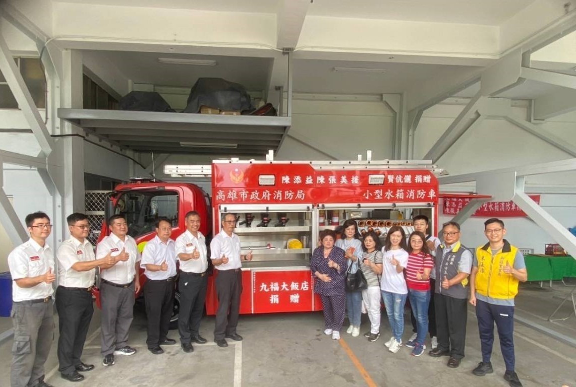 九福大飯店董事長陳添益及夫人陳張美援女士深知消防員日夜堅守崗位,冒險守護市民安全,特別捐贈高雄市政府消防局一輛小型水箱消防車,以提升救災能力。今(29)日,於高雄市政府消防局第四救災救護大隊橋頭分隊駐地舉行捐贈典禮,由消防局副局長王宗展代表接受捐贈,並回贈感謝狀以表達崇高敬意。