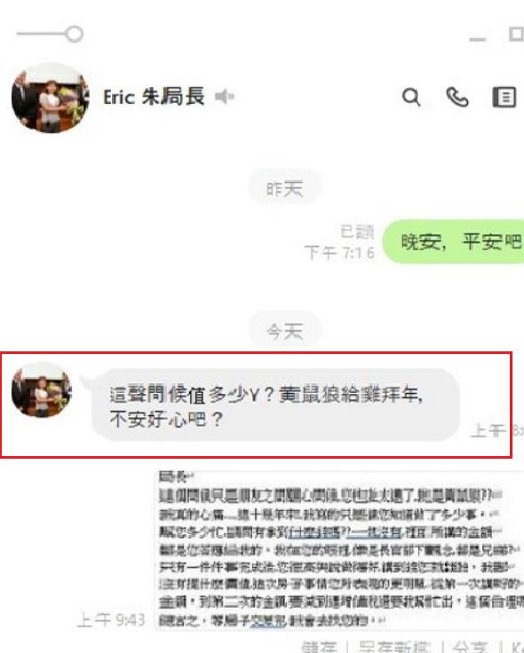范姓民眾說,簽約過後,朱博士突然變冷淡,非但不提佣金,反說因他要繳納一筆奢侈稅,要他分攤等語!讓他傻了眼?更甚就是4月花蓮大地震時,他擔心一些朋友安危特別發送line問候,不料對方卻回他「黃鼠狼拜年」等字眼,讓他錯愕難堪!自己關心的問候反遭對方奚落。