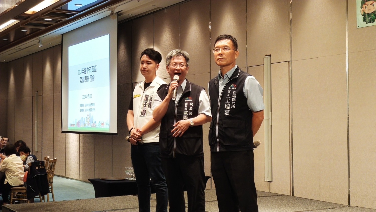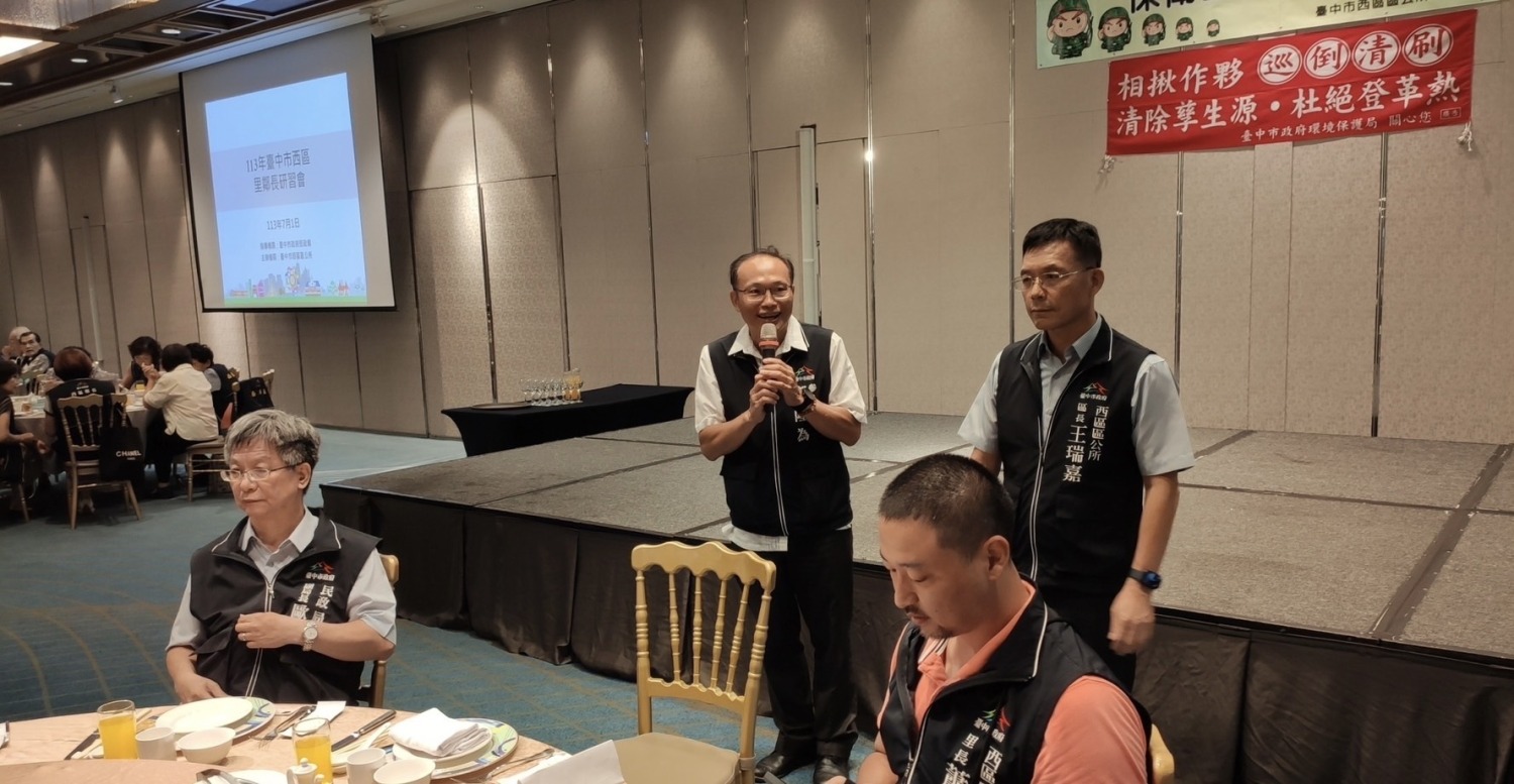 為增進里鄰長專業知能,提升為民服務品質,臺中市西區區公所於今(1)日上午9時30分在日華金典國際酒店13樓舉行「臺中市西區113年度里鄰長研習會」。市府鄭隆為參議及民政局歐陽明副局長代表盧秀燕市長、吳世瑋局長向辛苦的里鄰長們致意,感謝配合市府各項政策,使市政能順利推動。本區立法委員羅廷瑋、議員江肇國及張彥彤、黃守達服務團隊亦到場全程參加。