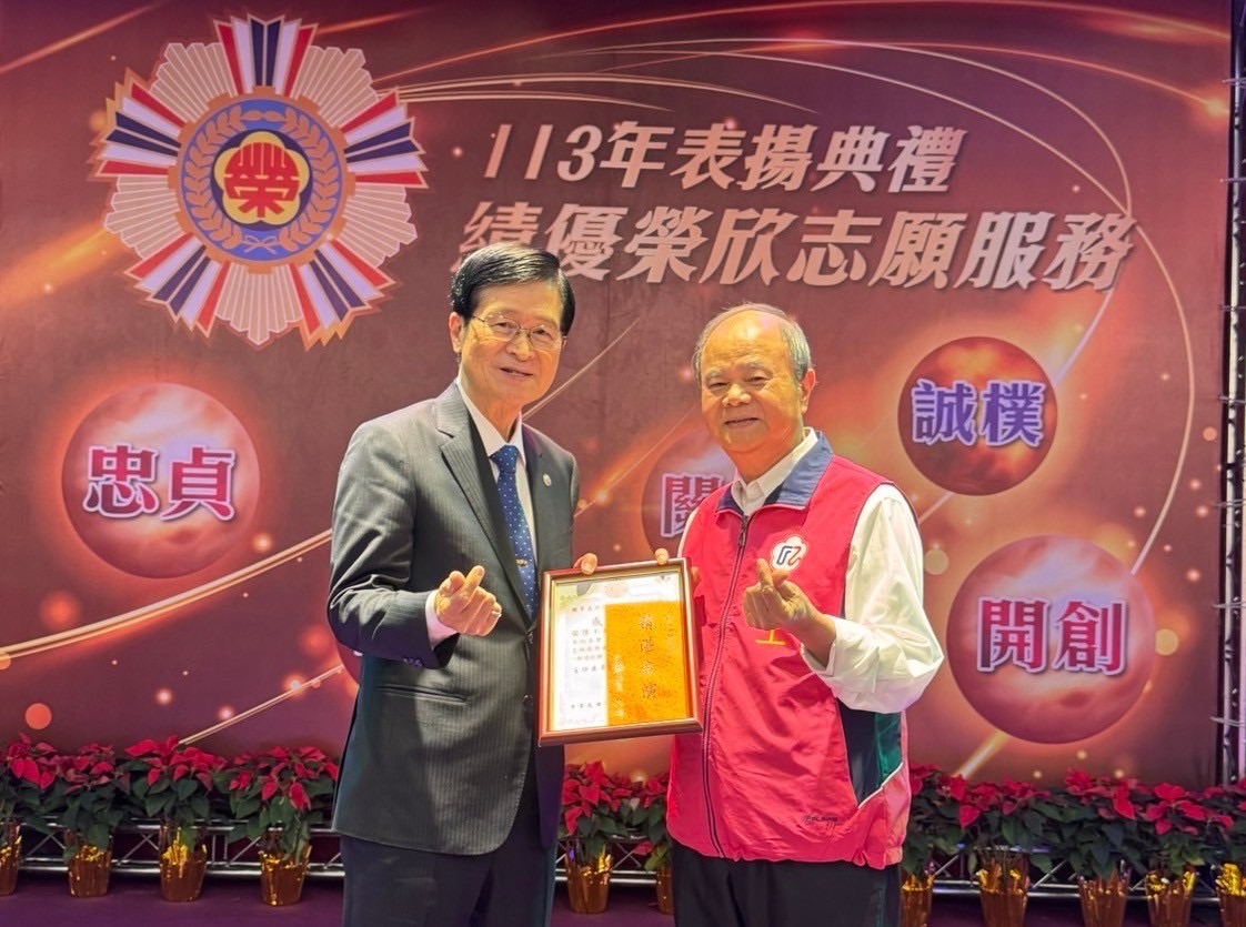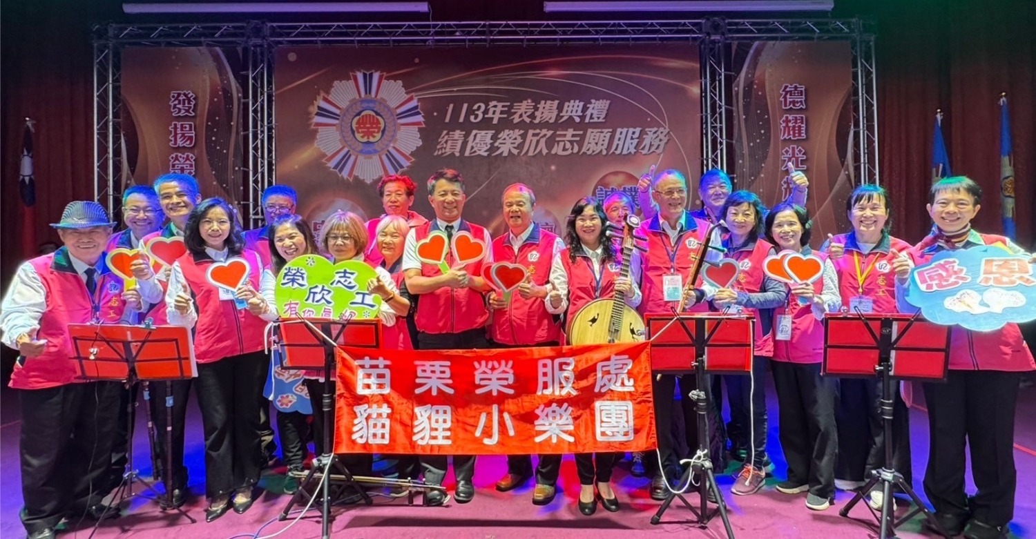 輔導會近日於臺北國軍英雄館舉辦113年「績優志工表揚活動」,苗栗縣榮民服務處於慰勉餐會期間擔綱表演任務。榮欣志工隊第一隊隊長陳龍於接獲任務後,組織具國樂專長的志工組成貓貍小樂團,並利用數個假日召集團員練習默契,在表揚大會大放異彩一鳴驚人。獲輔導會嚴德發主委頒發表演感謝狀及獎金,由貓貍小樂團陳龍團長受領。