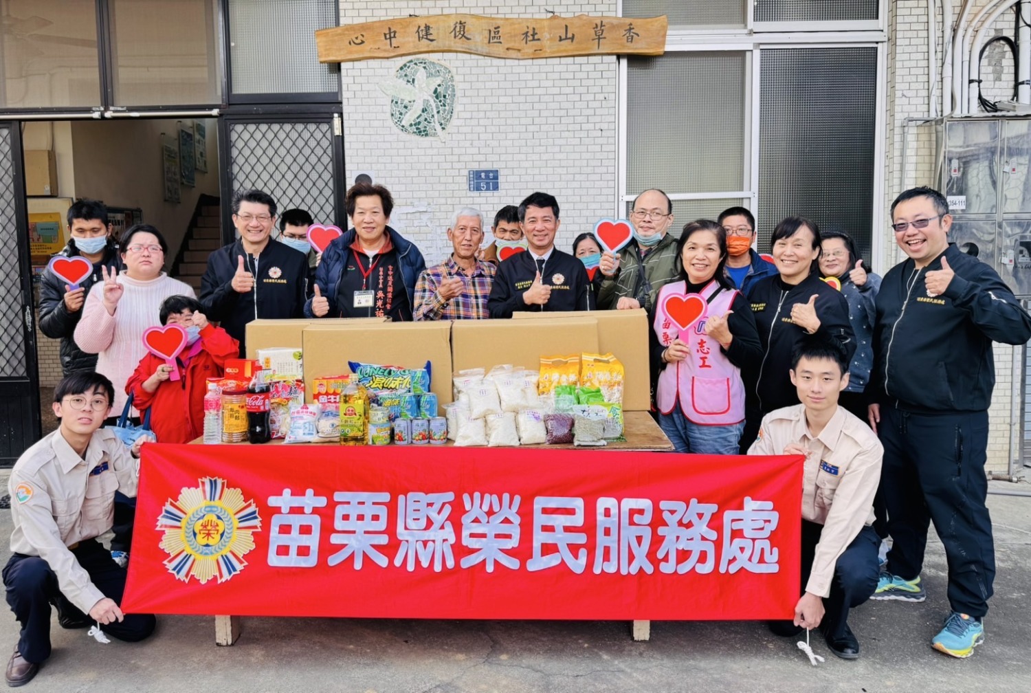 春節將近,苗栗縣榮民服務處為照顧更多榮民(眷),將近日接收之食物箱及大米等善心物資,由陳立中處長偕柯長榮副處長、雪中送炭關懷協會苗栗吳光祐分會長、服務團隊、榮欣志工及替代役男,捐贈苗栗縣香草山社區復健中心,由中心經營者郭孝義代表受贈,共同為關懷榮民(眷)盡一份心力。
