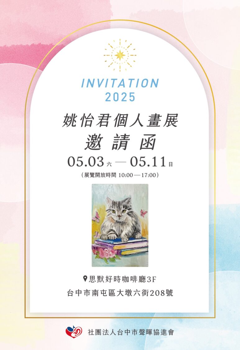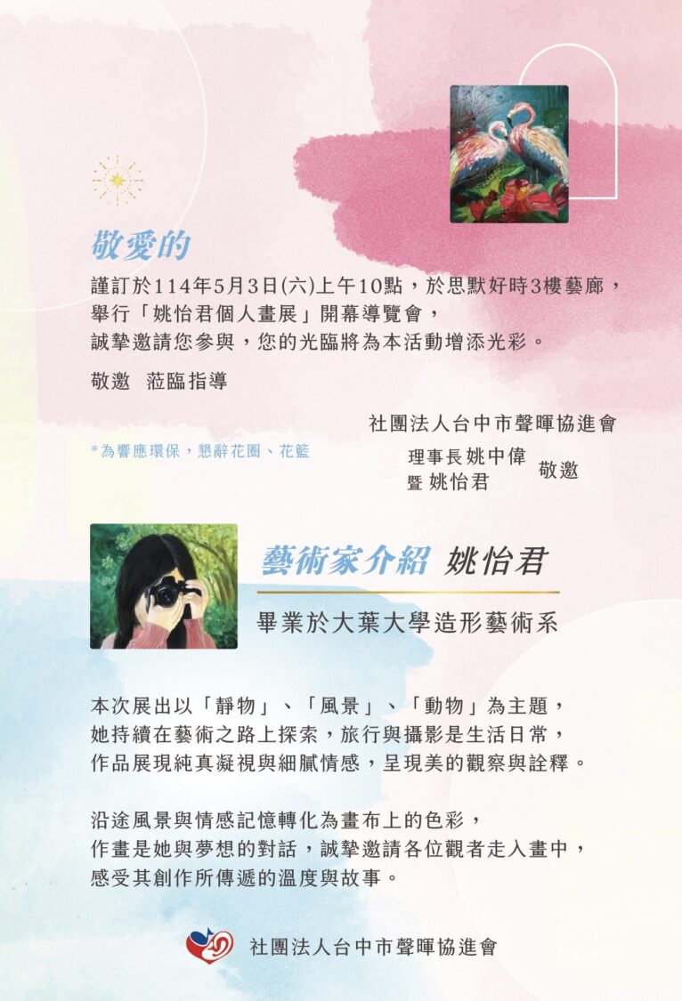 由社團法人台中市聲暉協進會主辦的「姚怡君個人畫展」,於114年5月3日上午10時在臺中市南屯區「思默好時咖啡廳」3樓正式開幕。本次展覽展出至5月11日止,展期為期九天,每日開放時間為上午10點至下午5點,歡迎民眾前往欣賞這位陽光女孩以畫筆傳遞的生命故事與藝術情懷。