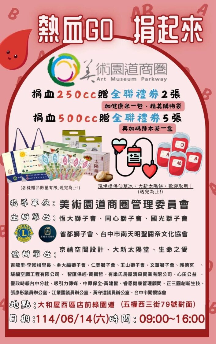 為響應6月14日「世界捐血人日」,一場凝聚社會溫暖與公益力量的《2025愛心捐血活動》將於當日上午9點至下午4點,在台中市大和屋西區店前綠園道(五權西三街79號對面)熱情舉行。本次活動由恆大獅子會、同心獅子會、省都獅子會、國光獅子會共同主辦,多個獅子會分會長投入與大新太陽堂、美術園道商圈管理委員會及多個地方團體協辦,並由生命之愛志工團隊統籌策劃,全力推動「熱血救人」的公益行動。