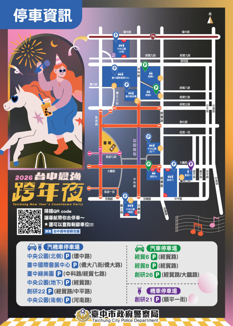 在停車方面,中央公園周邊設有經貿6、經貿8、創研22、創研26、中央公園北側/地下/南側停車場,以及臺中國際會展中心、臺中綠美圖等汽車停車場;機車停車區則包含中央公園及創研21、22等地點。警方提醒,停車位有限,建議民眾出發前先查詢即時車位資訊。