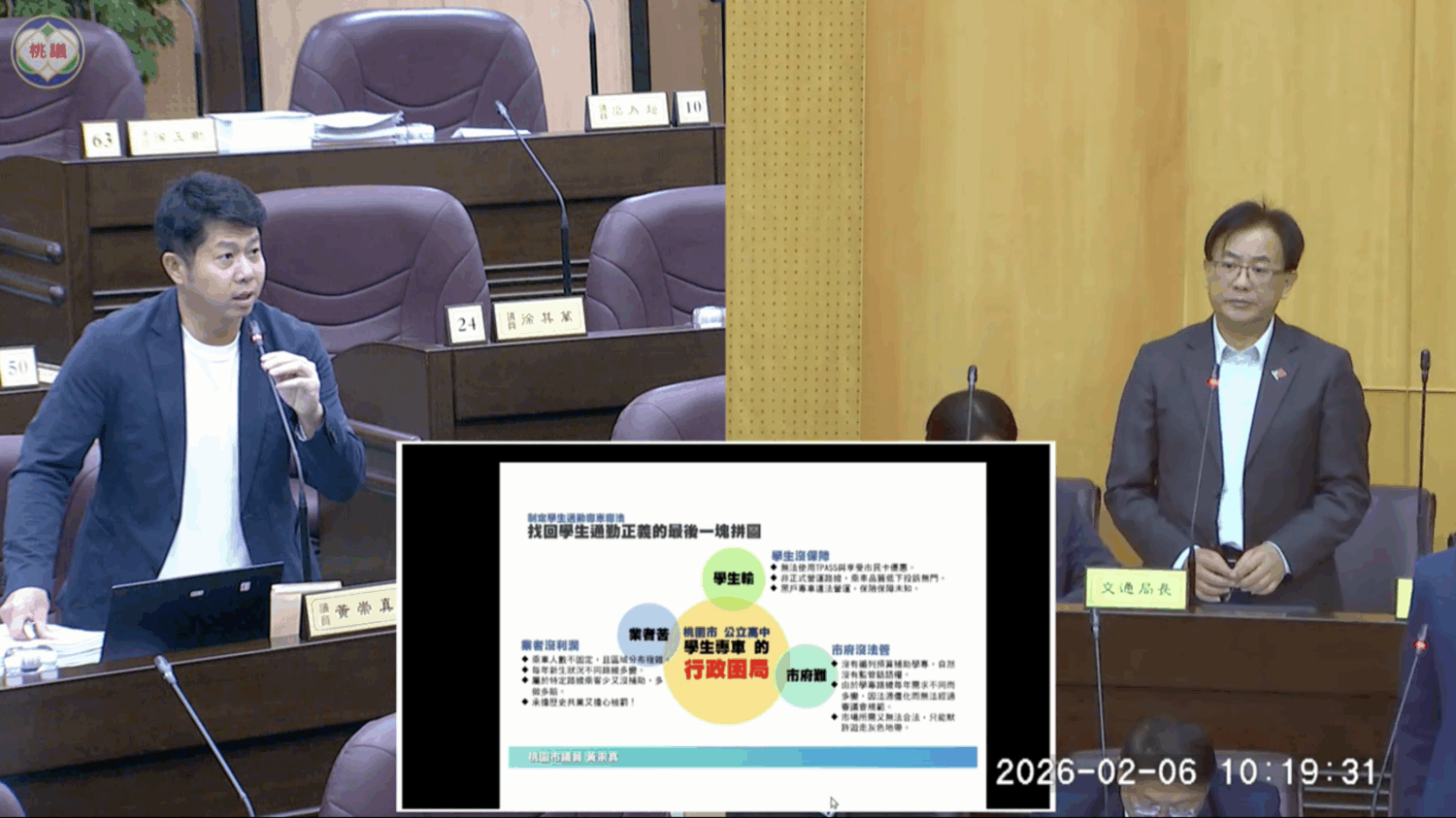 交通局長張新福則說明,學生專車因學生來源、居住地變動頻繁,每學期路線都會調整,因此未全數納入正式公車路線管理。不過黃崇真質疑,學生專車使用的是綠色公車牌照,依法若未經審議不應上路,卻長期處於「可跑、但不算正式公車」的模糊狀態,合法性也備受質疑。