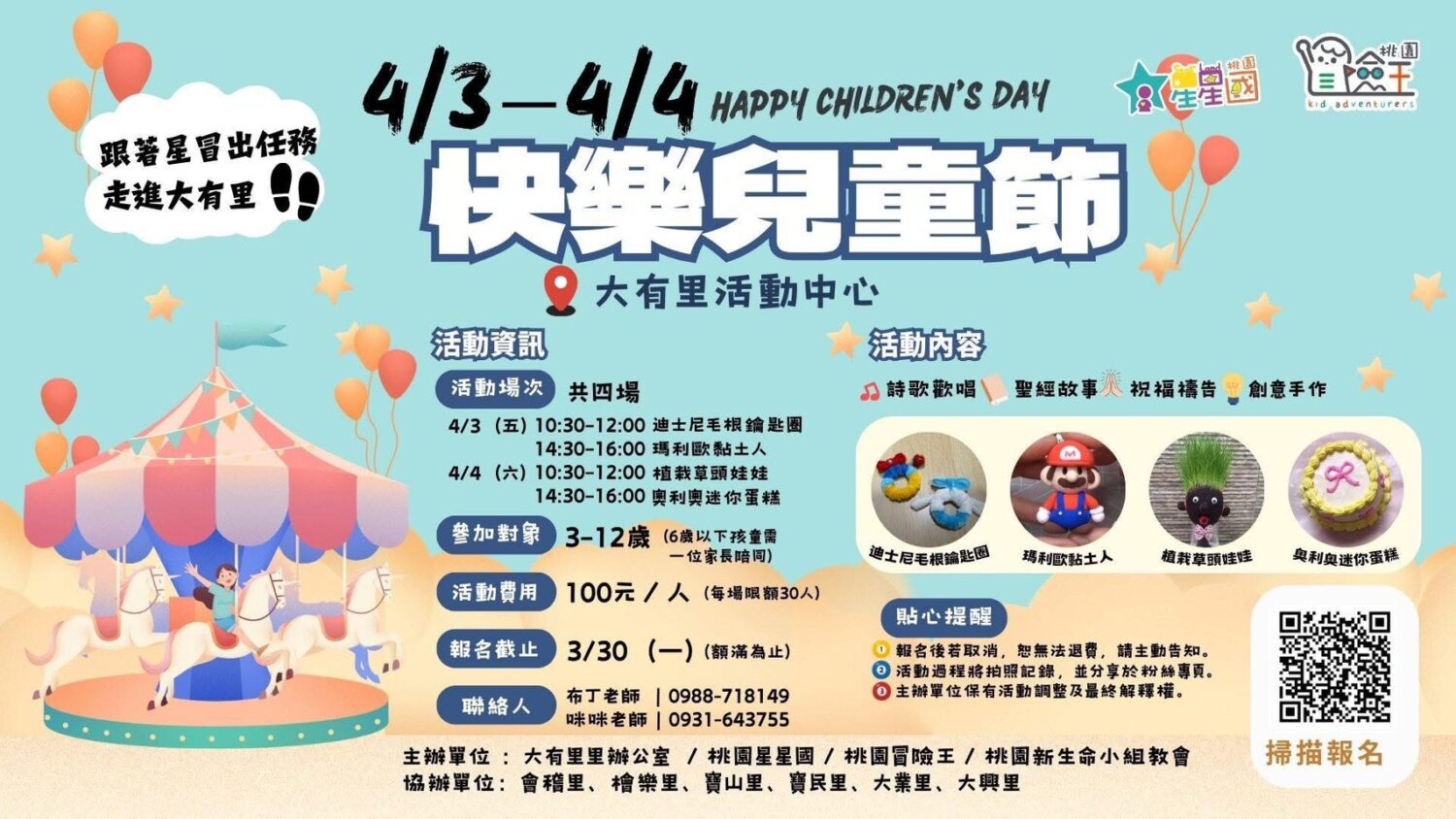 【警政時報 崔兆慧/桃園報導】桃園市桃園區大有里於今(3)日及明(4)日舉辦「快樂兒童節」活動,邀請桃園新生命小組教會團隊進駐,透過旗下「桃園星星國」與「桃園冒險王」帶領孩子們進行多元手作與互動體驗,吸引約180名家長與小朋友報名參加。