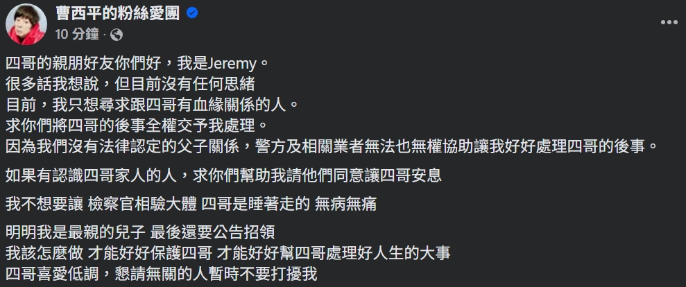 吳男今天在社群發文表示,自己目前情緒混亂,但最急迫的是希望能找到與曹西平有血緣關係的家人,並拜託「把後事交給我處理」。他提到,因雙方並非法律上認定的父子關係,導致在程序上無法以家屬身分處理相關事務,讓他感到無助。