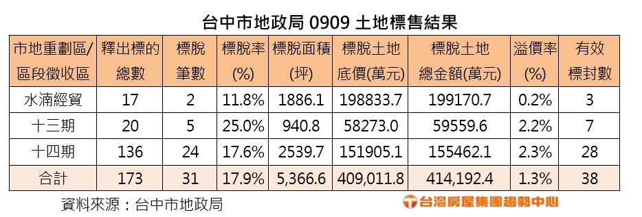 【賴傳媒、記者爆料網 王鈞生╱綜合報導】台中市今(9日)土地標售共釋出173筆土地,總底價將近227億元,但投標狀況仍不盡理想,計有41封標單(有效標封數38封),參與34筆土地的競標,最終標出31筆土地,整體標脫率僅17.9%,標脫總金額41.4億元,更是近期標售的新低,顯示買家出價十分保守,市場氣氛未因金管會鬆綁銀行法72-2天條轉熱。