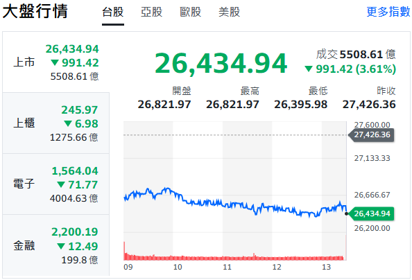【Lai傳媒、記者爆料網/謝建成/台北報導】台股今(21)日開低走低,盤中一度重挫1030.38點,終場雖小幅收斂,仍大跌991.42點,收在26434.94點,正式跌破季線26470點,寫下史上第6大單日收盤跌點,成交值達5498.35億元,市場氣氛相當悲觀。