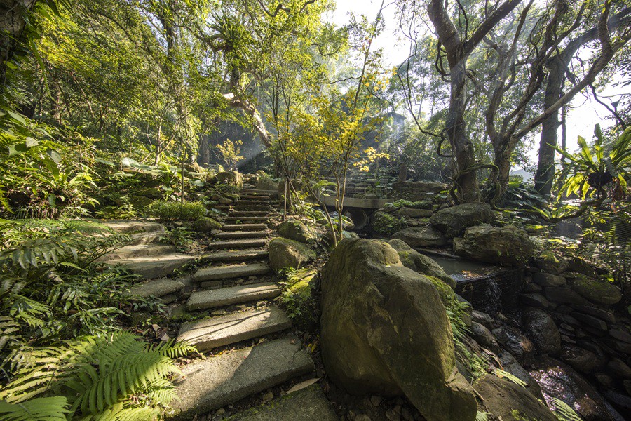 結束上半日的周邊走訪後,行程回到位於三峽插角里的「大板根森林溫泉酒店」,坐落於牛角尖山與內金敏山之間、大豹溪畔,園區本身即是一座占地17公頃的國寶級亞熱帶雨林,是新北市少數能同時體驗原始森林與天然溫泉的場域。園區內建築沿著椰林大道錯落分布,一踏入即可感受高聳林木包圍下的沉穩氛圍。後方規劃完善的森林步道,適合過年前放慢腳步健走,穿梭在百年老樹與蕨類植物之間,呼吸濕潤清新的空氣,讓身心逐漸回歸自然節奏。