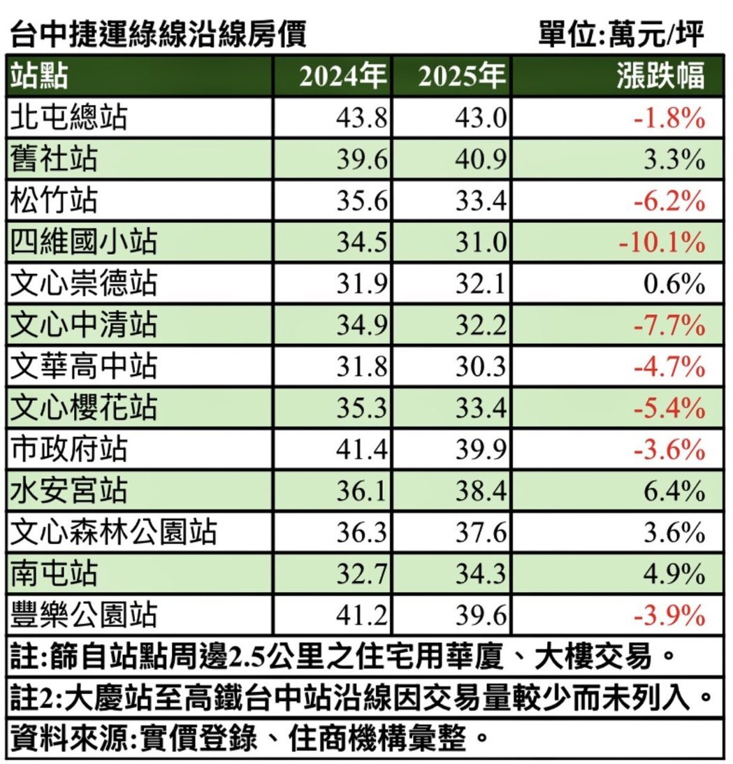 2021年4月正式啟用的台中捷運綠線,通車即將滿5年,住商機構統計實價登錄,比較綠線沿線各站點近一年房價變化,其中位處蛋黃區的各站,房價表現卻是跌多於漲,除了四維國小站點周邊下跌1成、均價至31萬元以外,另外文心中清、文華高中站皆有5%左右修正。