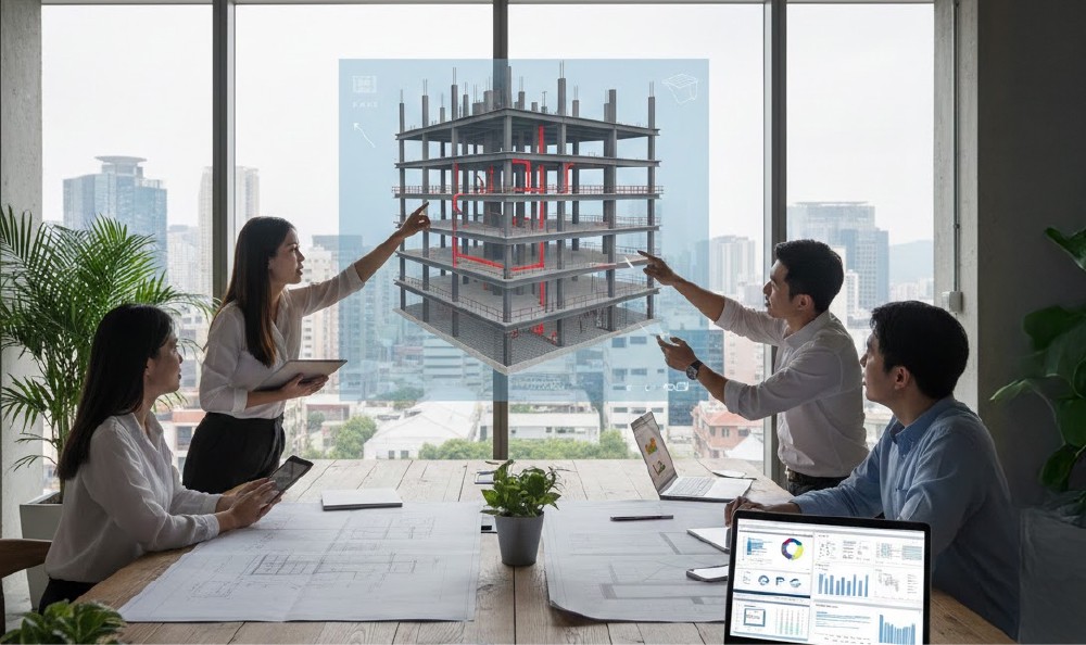 正旭鋁模源自顯文工程於傳統木模 30 年現場經驗,深知工地最大成本經常來自於「重工」,因此團隊不只聚焦模板工程,更延伸至整體施工流程,涵蓋水電、鋼筋、鷹架與放樣等關鍵工序,提前整合各工種,降低現場衝突。透過 BIM 建構高精度三維模型,整合結構、建築、機電系統,在動工前完成碰撞檢討與數量精算,達到優化工序並讓業主能精準掌握工程數量與成本,將現場作業由經驗導向轉為數據管理。