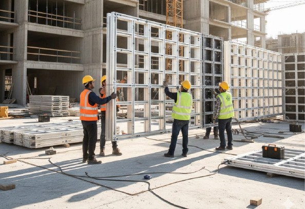 為確保施工精準,正旭鋁模工程採用建築全區 1:1 預組裝驗證流程,在出廠前即完成實體測試,並由未來實際進場的工班親自執行預組作業。透過出廠前的實作演練,團隊得以提前掌握各部零組件特性,確保模具進場後能立即流暢上手,有效降低待料與重工風險。