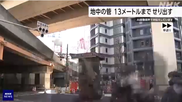 大阪梅田驚見「巨型鋼管破土而出」 13公尺高嚇壞通勤族、主幹道緊急封閉.(圖/翻攝 NHK 網站)