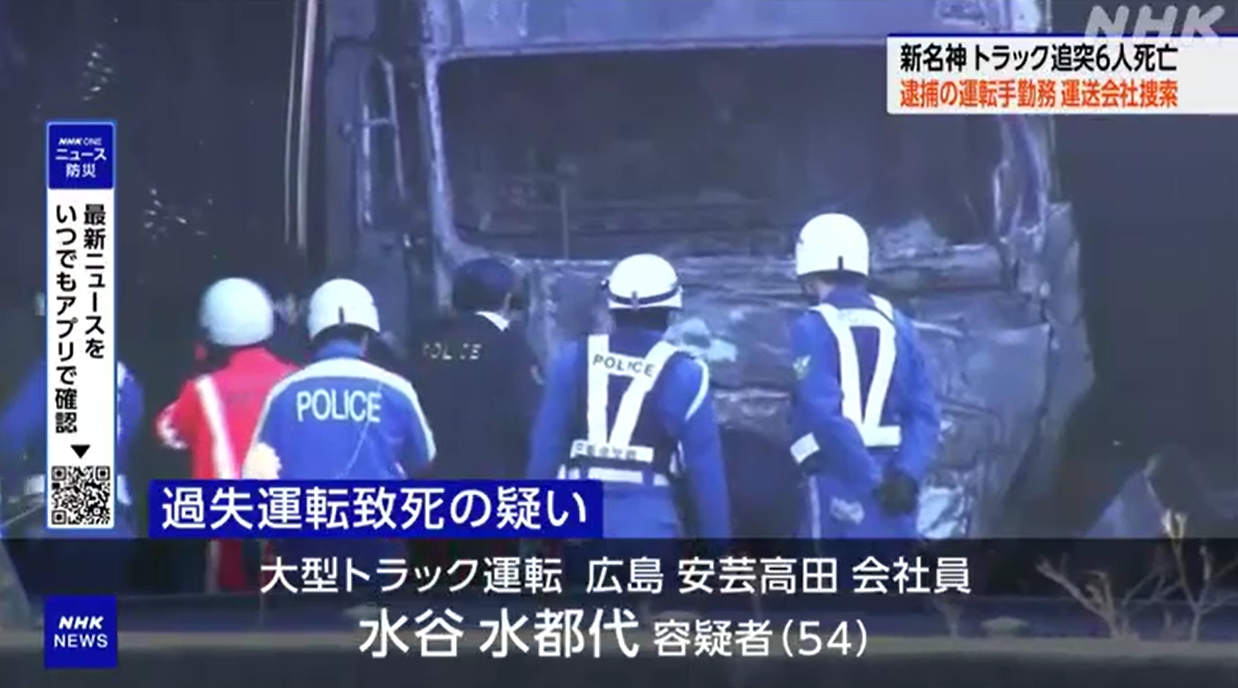 警方已依過失致死罪逮捕54歲駕駛水谷水都代,對方坦承犯行,供稱當時正從東京運貨前往廣島途中。21日上午,警方進一步搜索其所屬的廣島運輸公司,針對駕駛勤務安排、工時是否過長,以及公司安全管理制度展開調查。