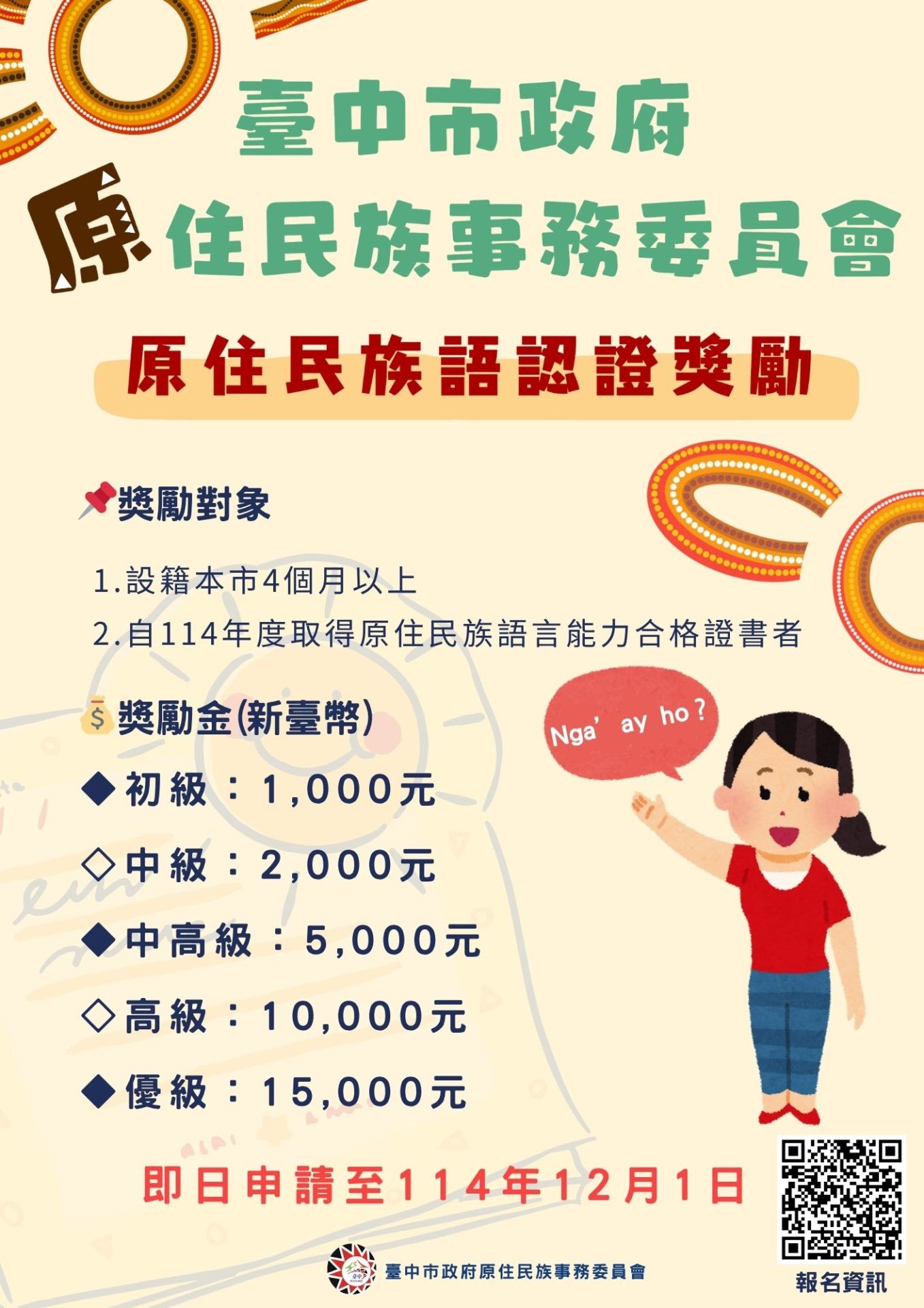 【記者爆料網、賴傳媒 潘俐雯/台中報導】在日常中開口說一句「Nga’ ay ho?」(阿美族語-你好的意思),不只是語言,更是一種文化的延續。臺中市政府原住民族事務委員會 ,今年推出「族語認證獎勵計畫」,凡設籍本市滿4個月的民眾,只要在114年度通過原住民族語能力認證,不分族群、不分等級,就能申請領取獎勵金,最高可達新台幣15,000元。