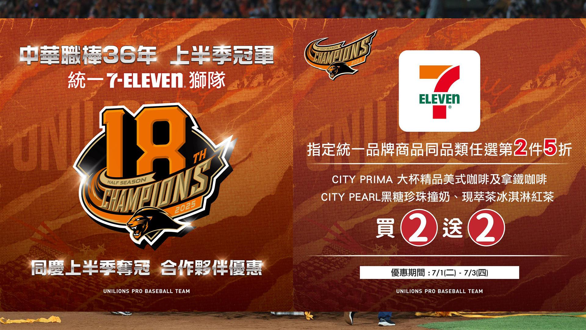 猛獅封王,全台嗨翻!中華職棒36年上半季冠軍29日出爐,統一7-ELEVEN獅隊在桃園球場擊敗樂天桃猿,順利讓魔術數字歸零,勇奪隊史第18座季冠軍。為了與球迷共享榮耀,統一超商、聯名品牌及合作夥伴火速推出一系列限定優惠,不只咖啡、冰品、按摩椅通通有折扣,還有比薩買一送一、襪子買一送一、票券加碼贈,堪稱史上最「豪」封王慶典。