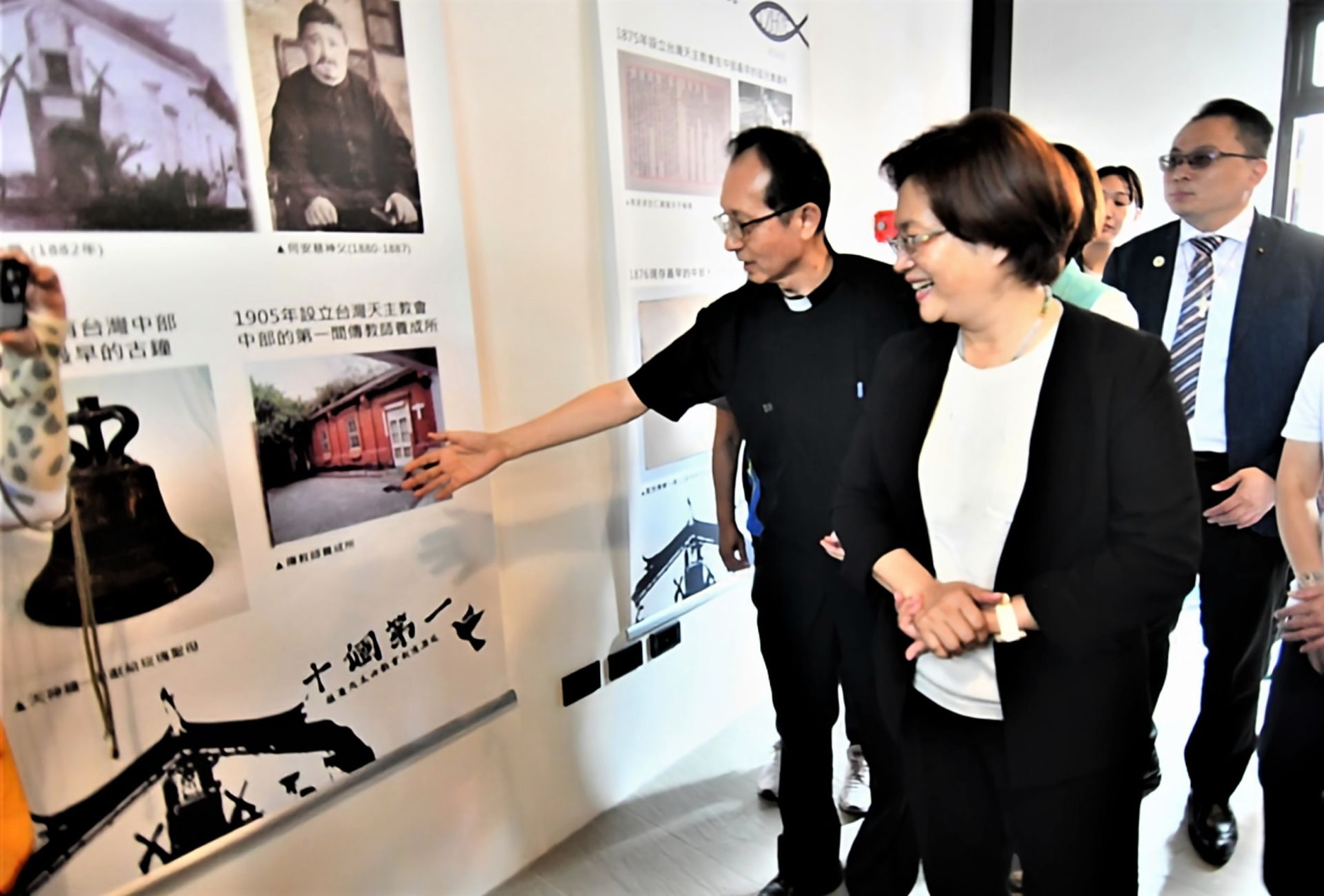 圖說:王惠美瀏覽羅厝天主教堂陳列的老舊照珍貴照片,邀請大家來欣賞