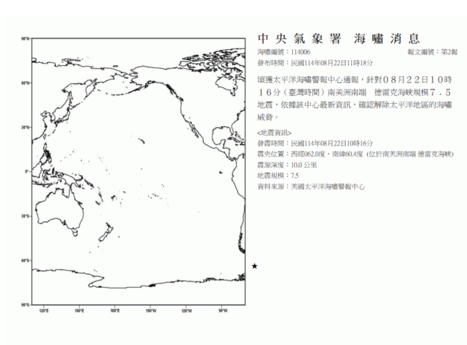 【賴傳媒、記者爆料網 林千允/綜合報導】中央氣象署今(22日)上午10時16分接獲太平洋海嘯警報中心通報,位於南美洲南端與南極洲之間的德雷克海峽發生規模8.0地震,震央位於西經62.00度、南緯60.40度,震源深度約10公里。氣象署表示,地震可能在太平洋地區引發海嘯威脅,目前將持續嚴密監測海嘯後續情況,並即時發布最新資訊。